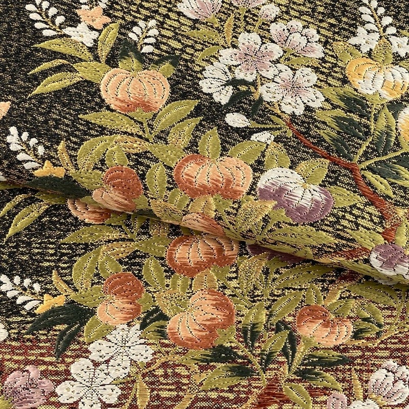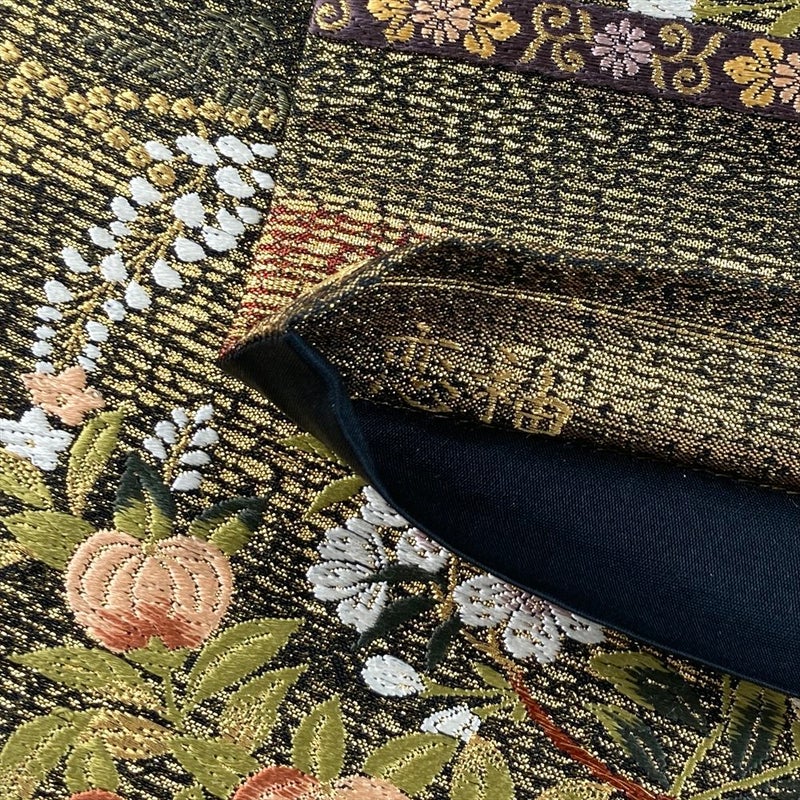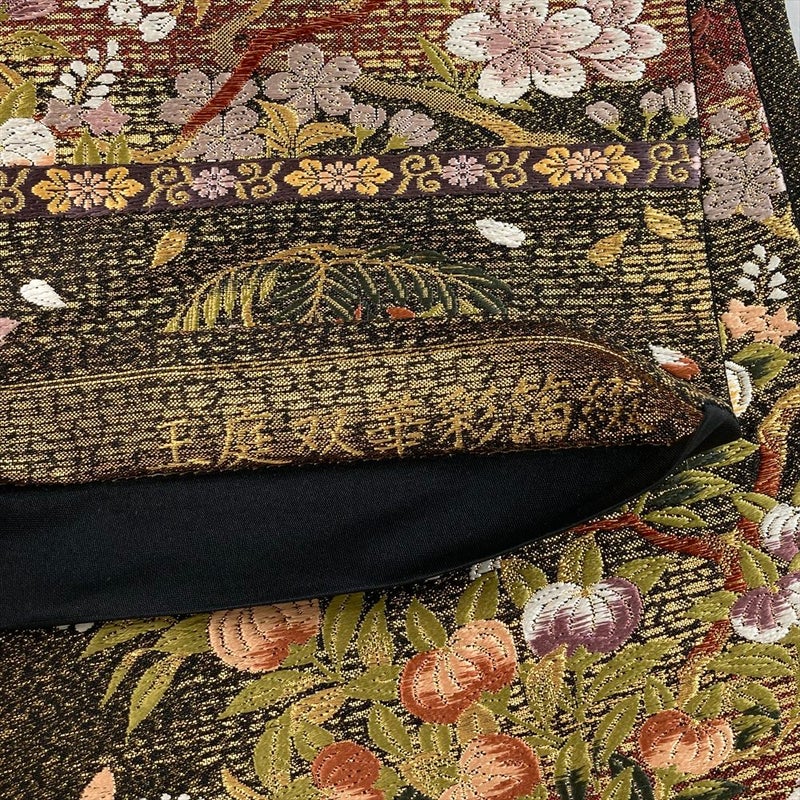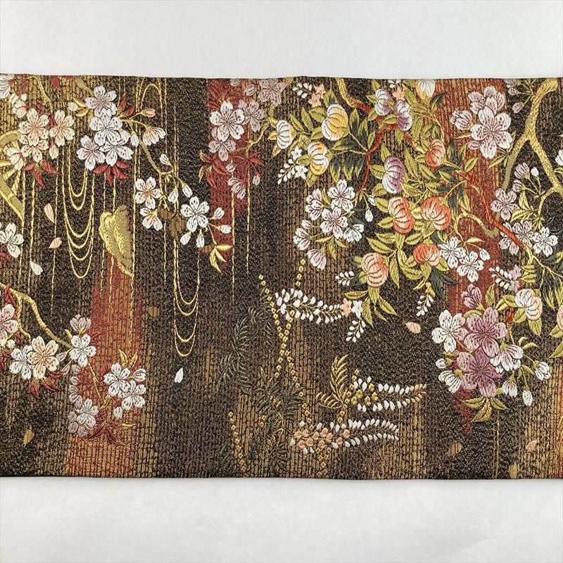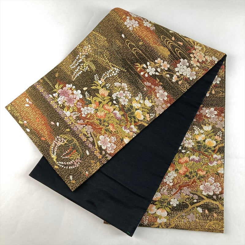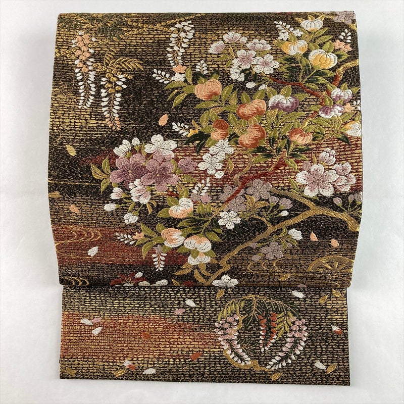 煌びやかな金地に、桜や藤の花意匠と流水文を王宮双可彩箔綴で表現した、格調高いフォーマル袋帯。