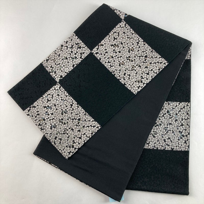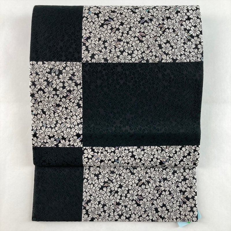 (中古)袋帯 黒 カジュアル セミフォーマル 六通 織り 市松 桜 絹