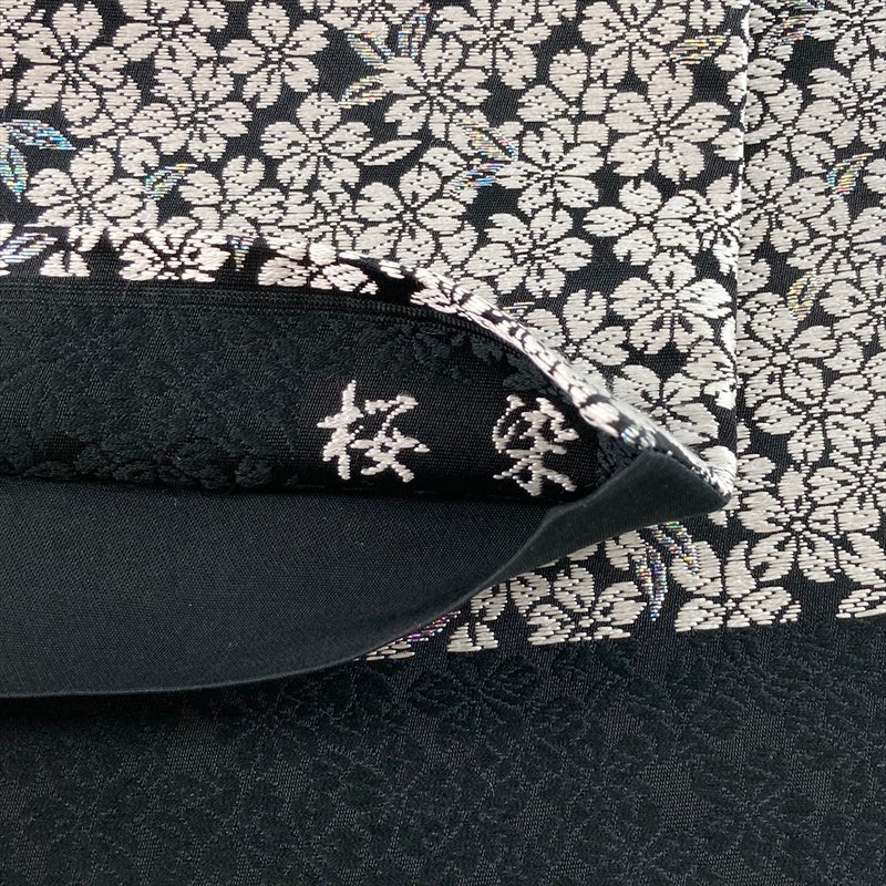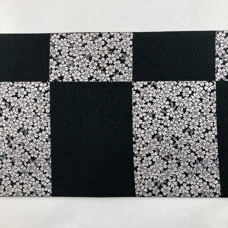 深みのある黒地に、市松文様と桜柄を配した袋帯。