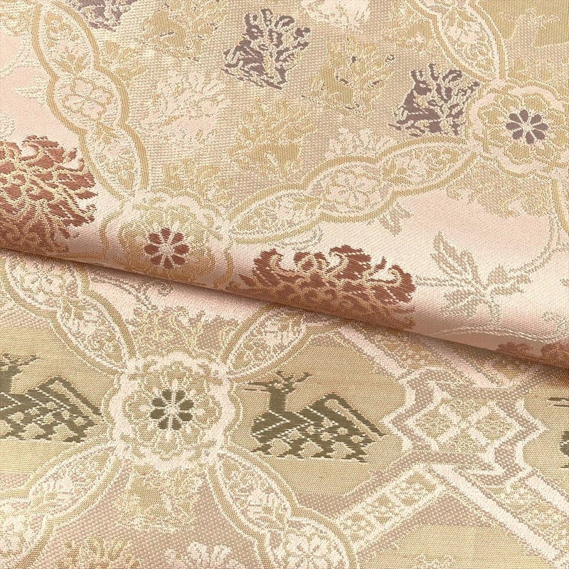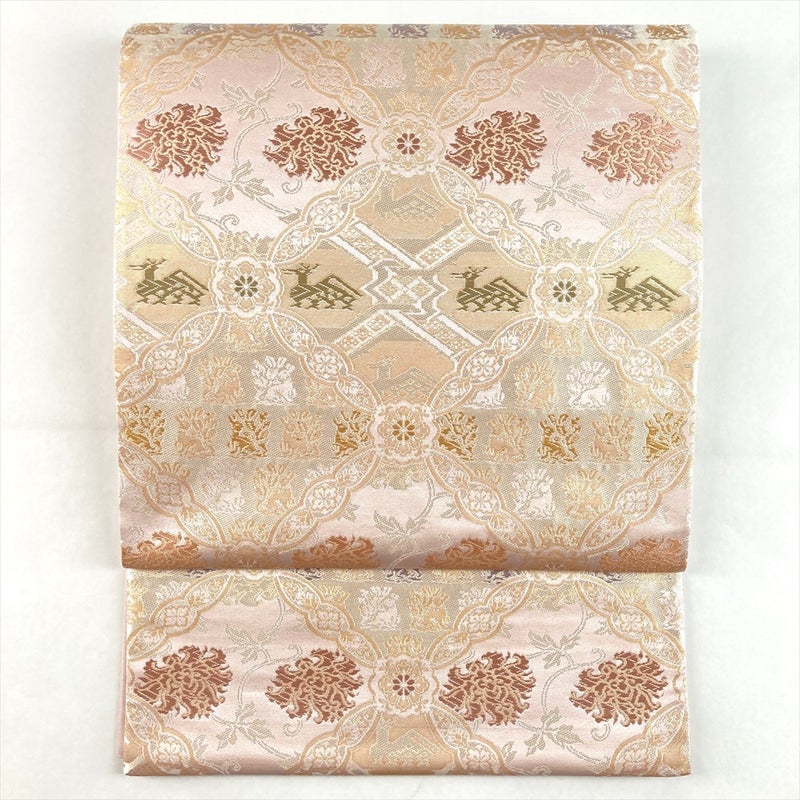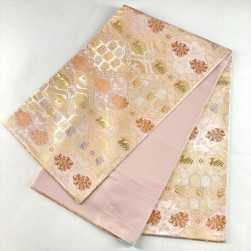 やさしい薄ピンク地に、箔屋清兵衛ならではの正倉院文様と愛らしい動物意匠を配した袋帯。
