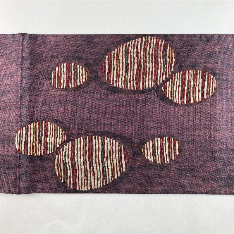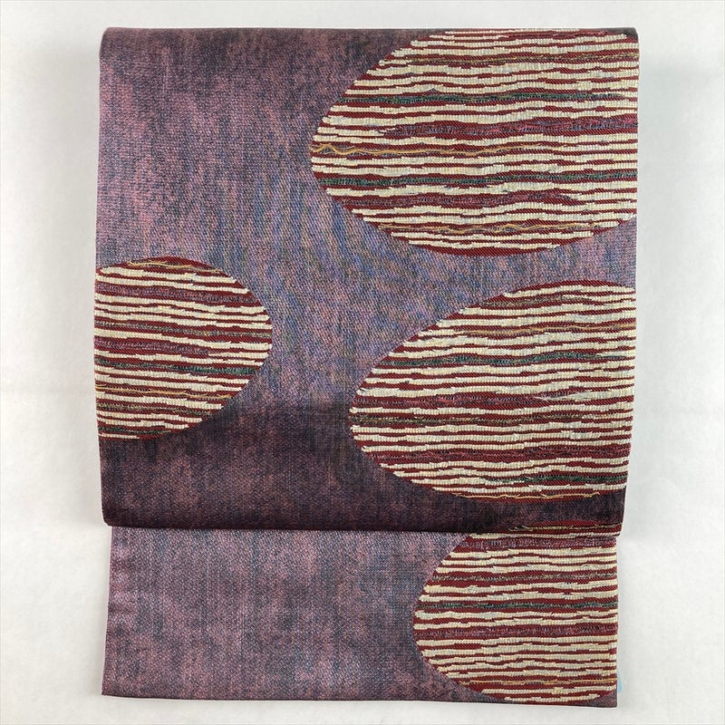 落ち着きのある紫地に、丸文と縞模様を配した洗練された袋帯。
