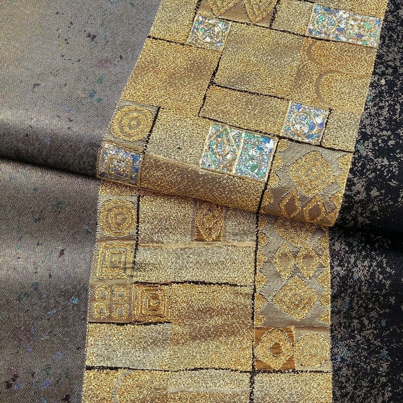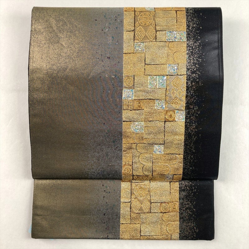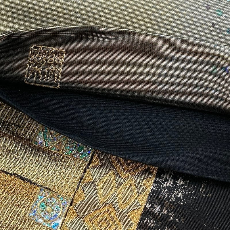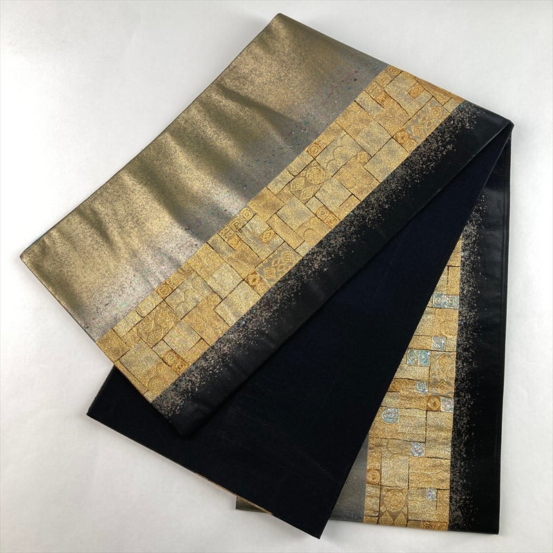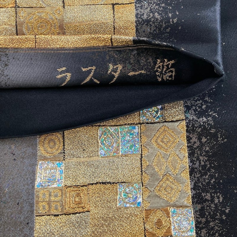 金と黒のコントラストが美しく、金の幾何学文様が洗練された輝きを放つフォーマル向け袋帯。