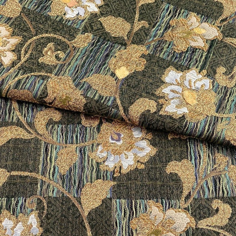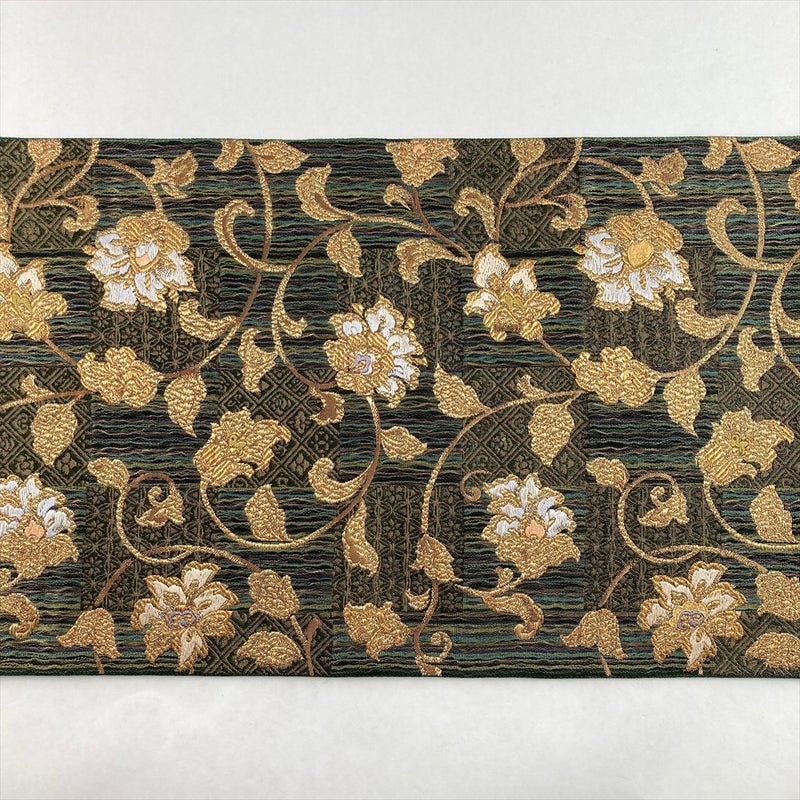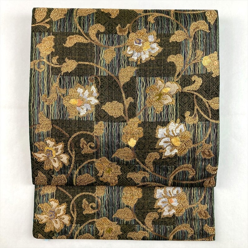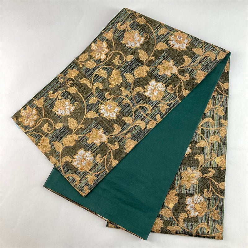 深みのある緑地に市松模様を配し、金の花唐草が格調高く映えるフォーマル向けの袋帯。
