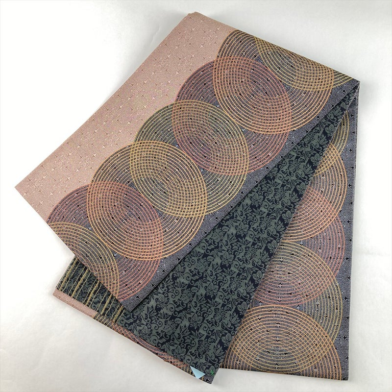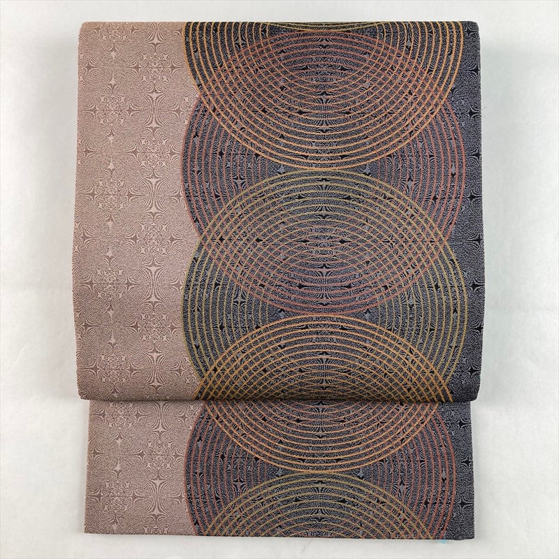 黒と茶の落ち着いた色調に、円文と幾何学模様を配した表情豊かな袋帯。