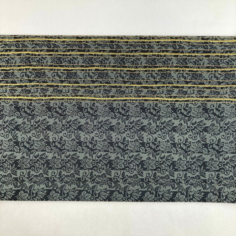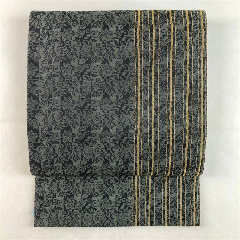 (中古)袋帯 黒 茶 緑 カジュアル セミフォーマル 全通 リバーシブル 織り 円 幾何学模様 縦縞 絹
