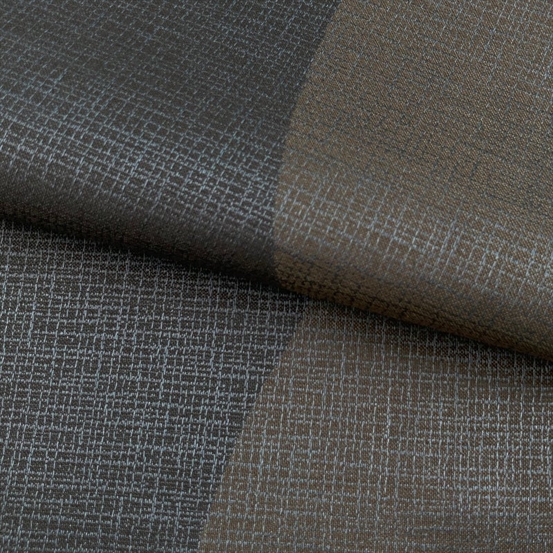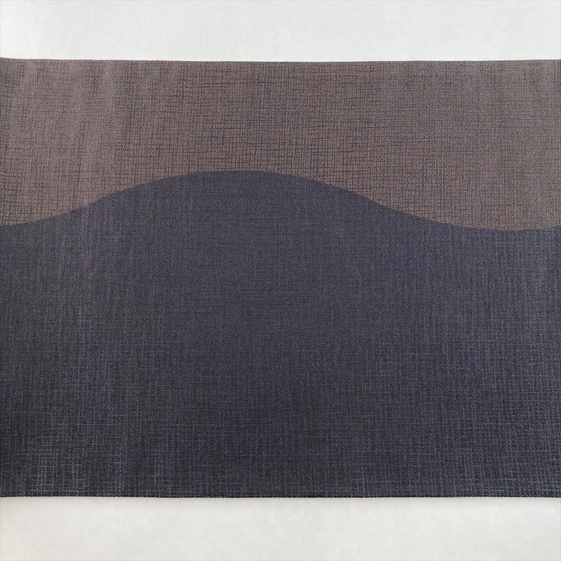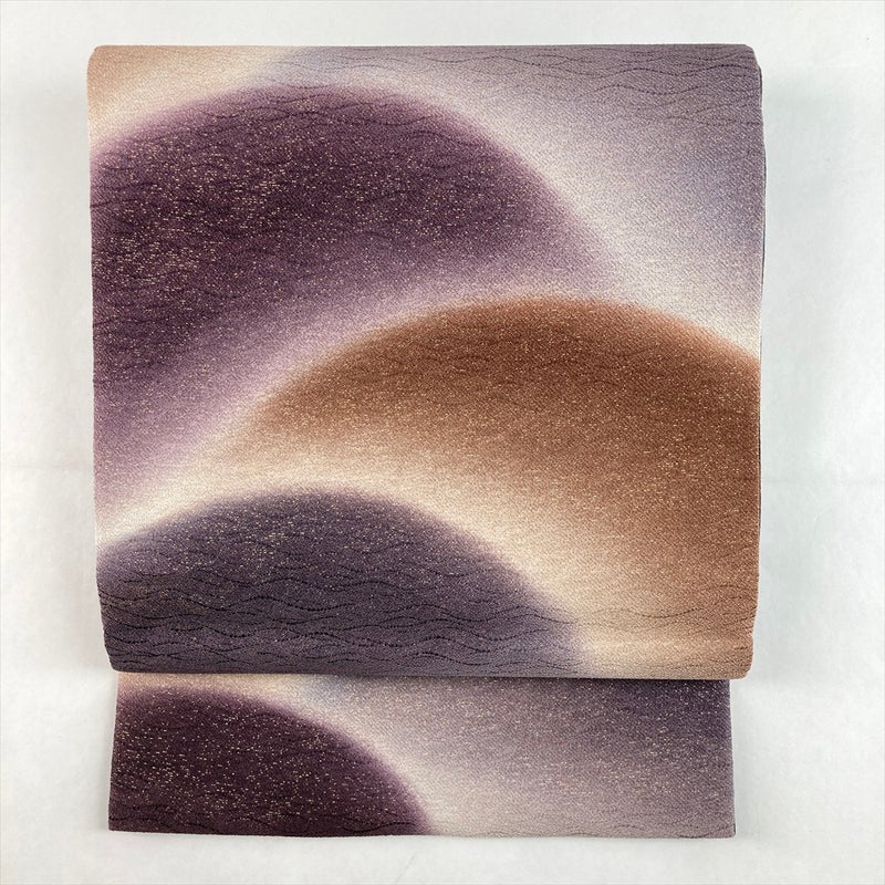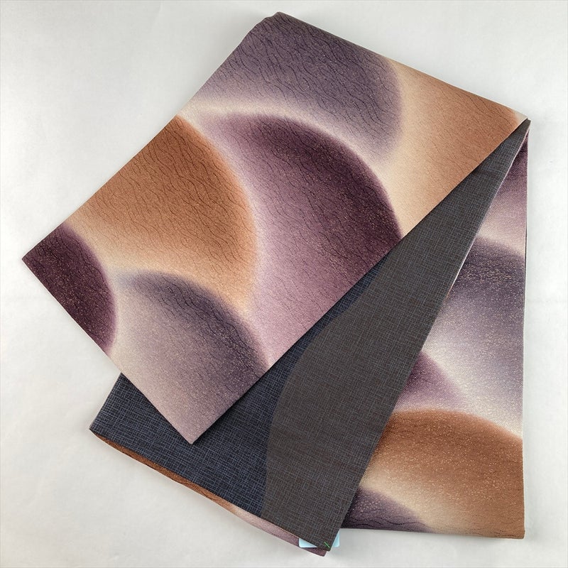 紫と茶の落ち着いた配色で遠山文様をあしらい、裏面には黒地の控えめな柄を配したリバーシブル袋帯。