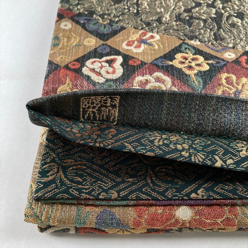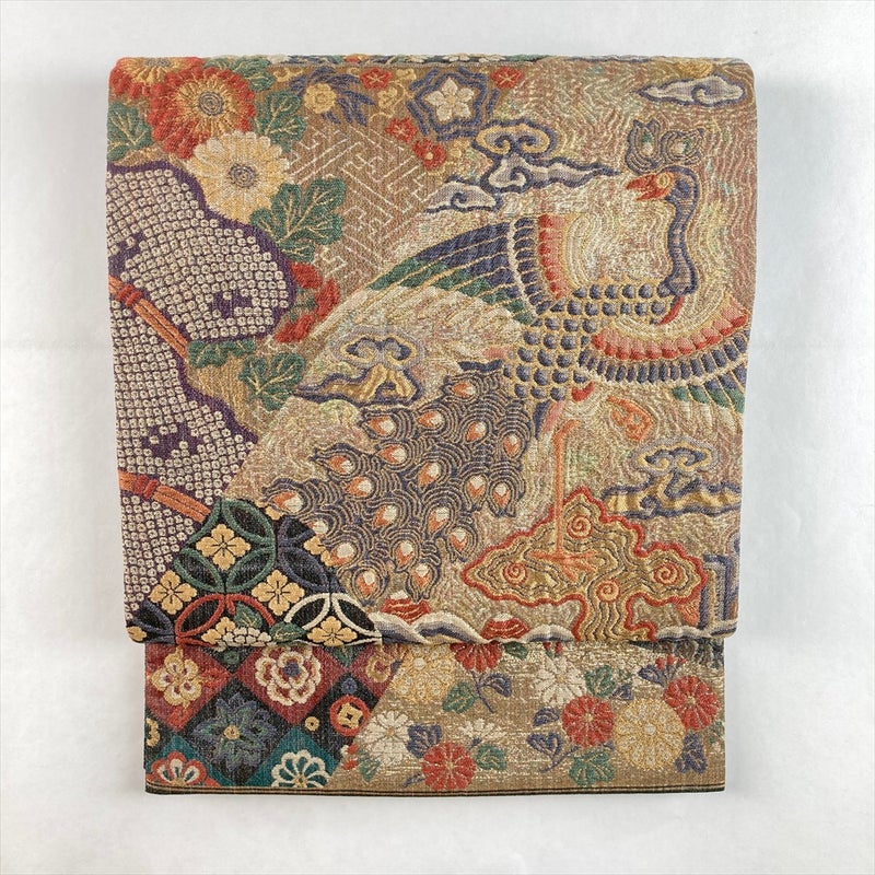 金地に、孔雀と菊、七宝などの吉祥文様を切り嵌め風に配した、華麗で格調高い袋帯。