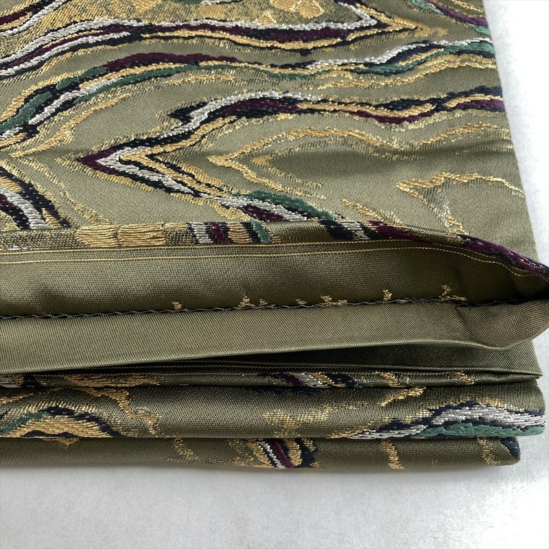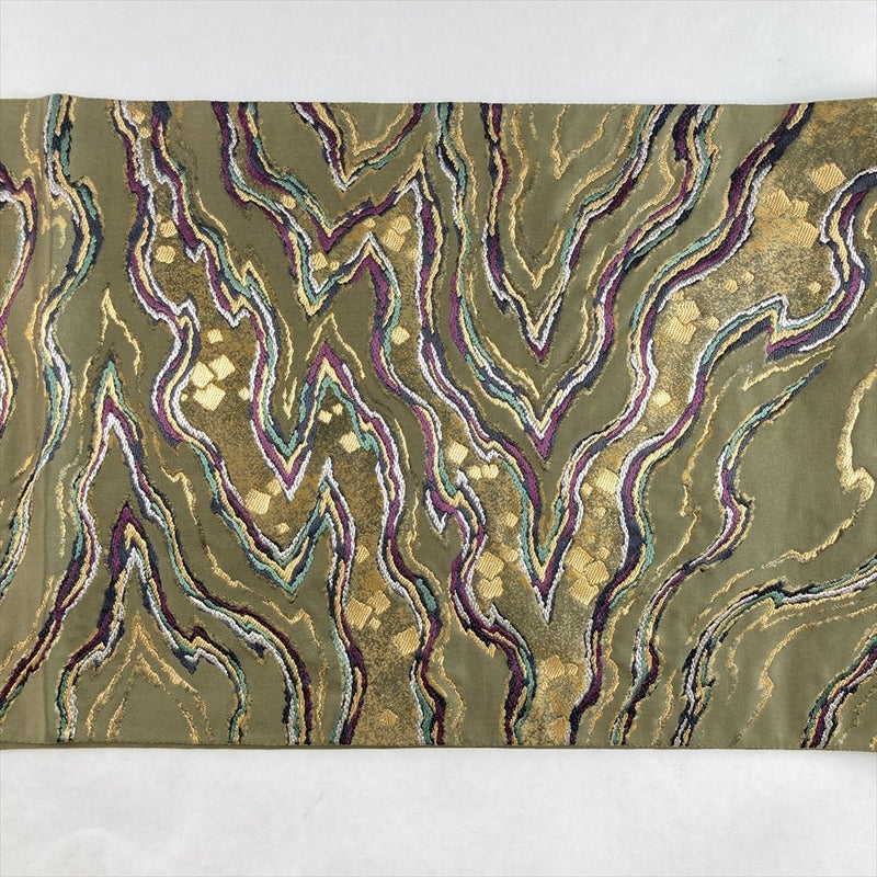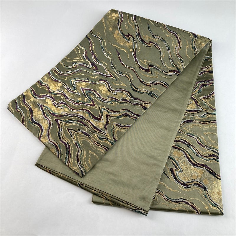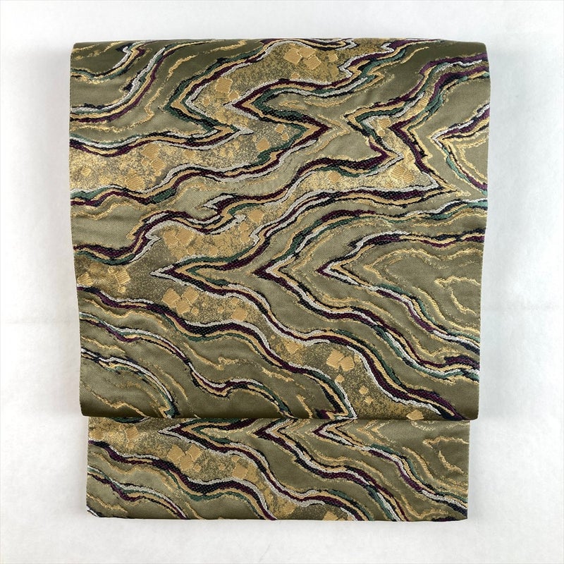 落ち着きのある茶緑色地に、穏やかに揺らぐ波文様を配した上品な袋帯。