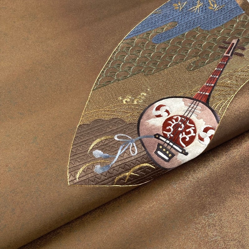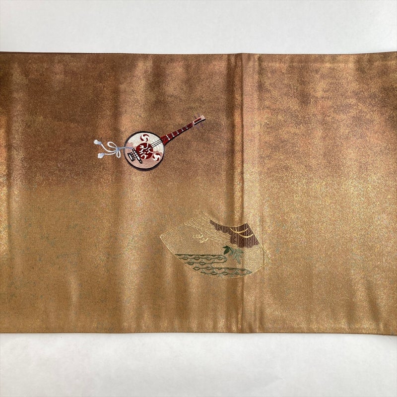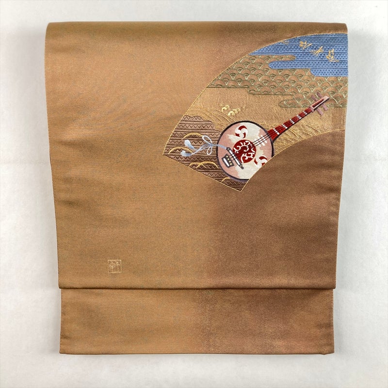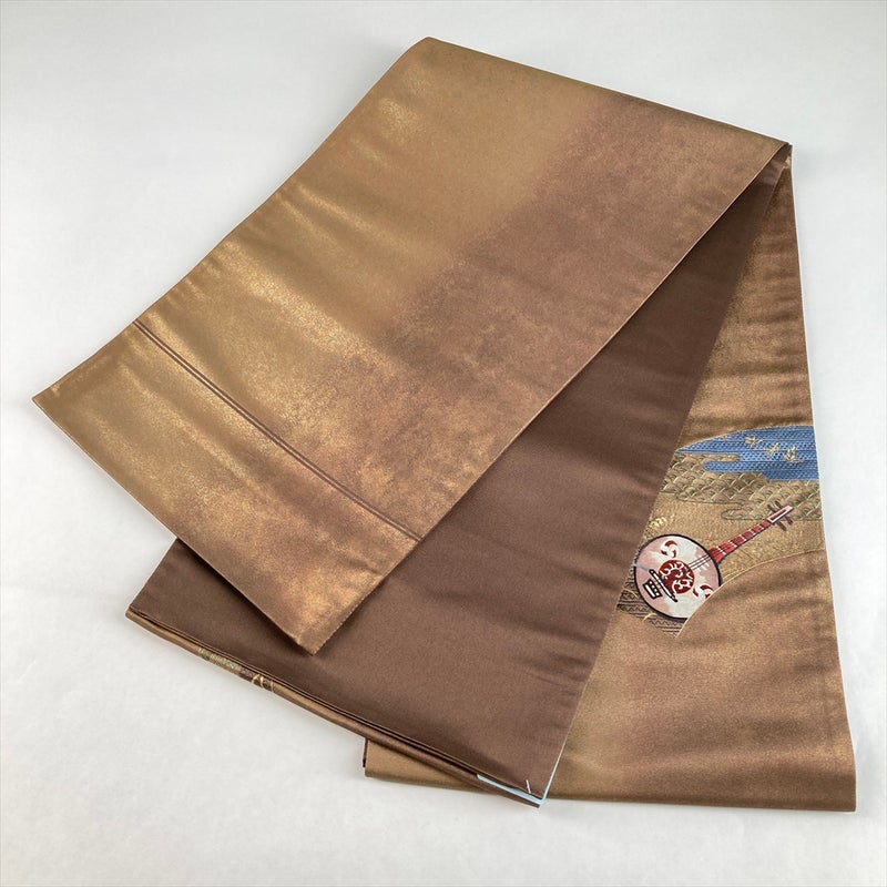 金と茶を基調に、扇面と琵琶楽器を刺繍で表現した趣深い袋帯。