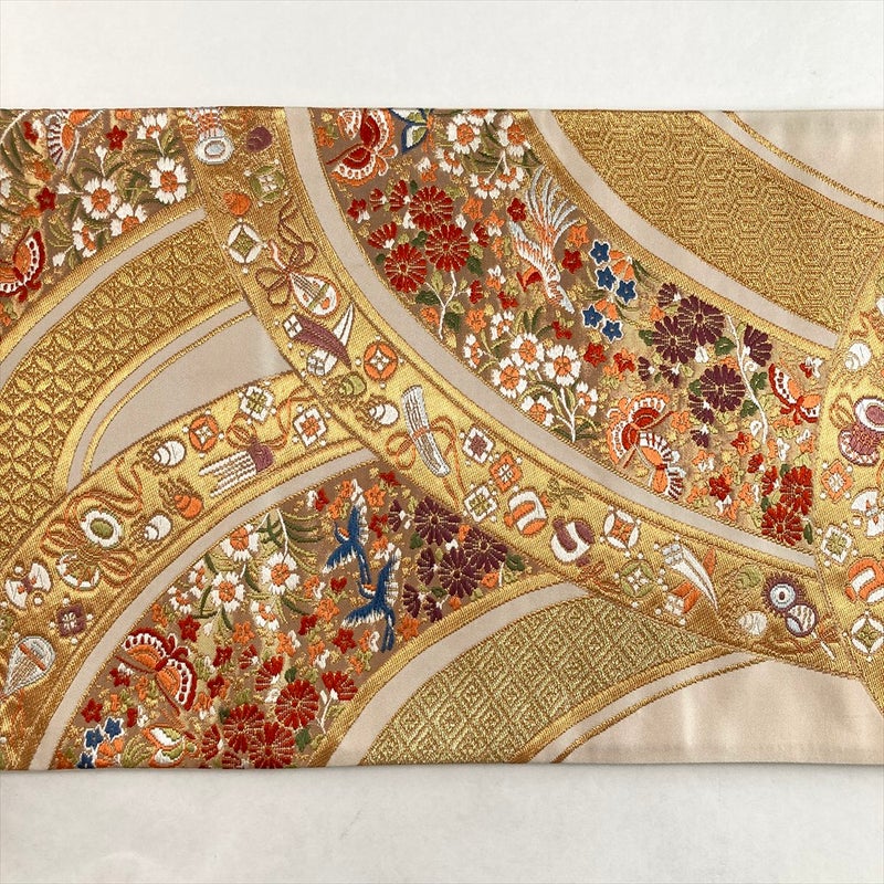 やわらかなアイボリー地に、金糸で宝尽くし・四季花・亀甲・七宝などの吉祥文様を贅沢に織り上げた、河合美術織物の格調高い袋帯。