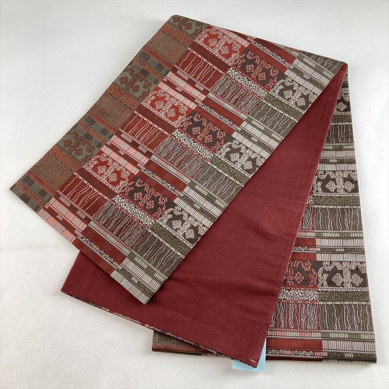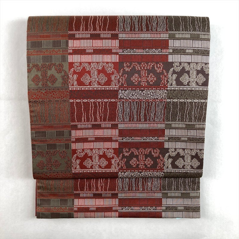 (中古)袋帯 赤 灰緑 カジュアル 全通 織り 縞模様 絹