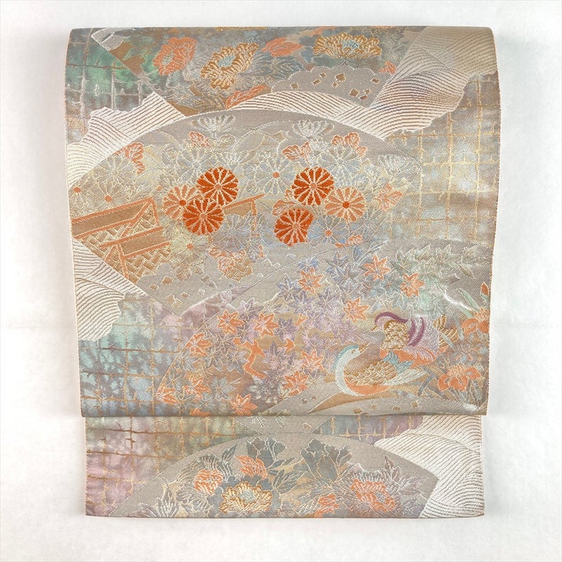 薄い金銀地に、格子と扇面文を配し、四季花と鴛鴦を織り込んだ服部織物の格調高い袋帯。