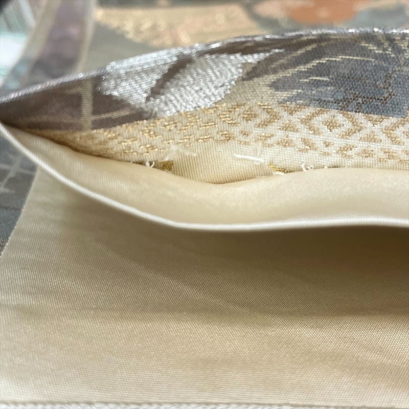 (中古)袋帯 薄金 銀 フォーマル 六通 引き箔 服部織物 扇面に四季花 鴛鴦 格子 絹