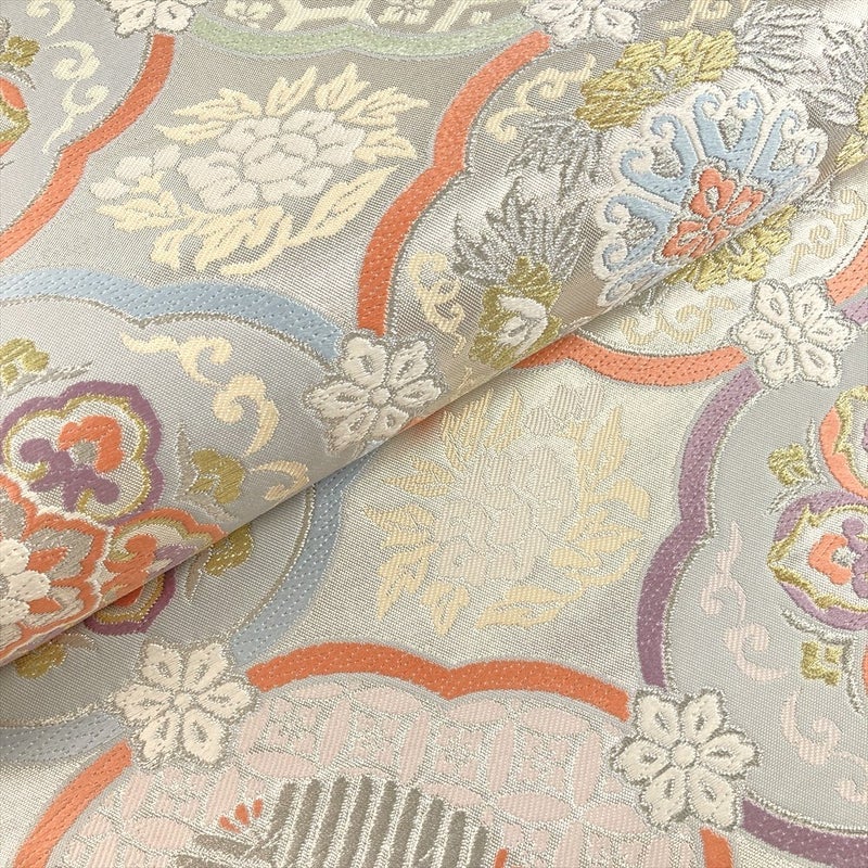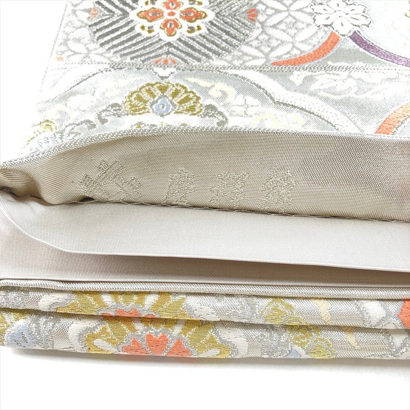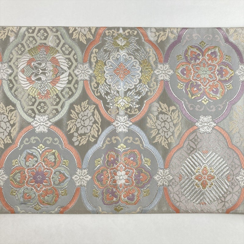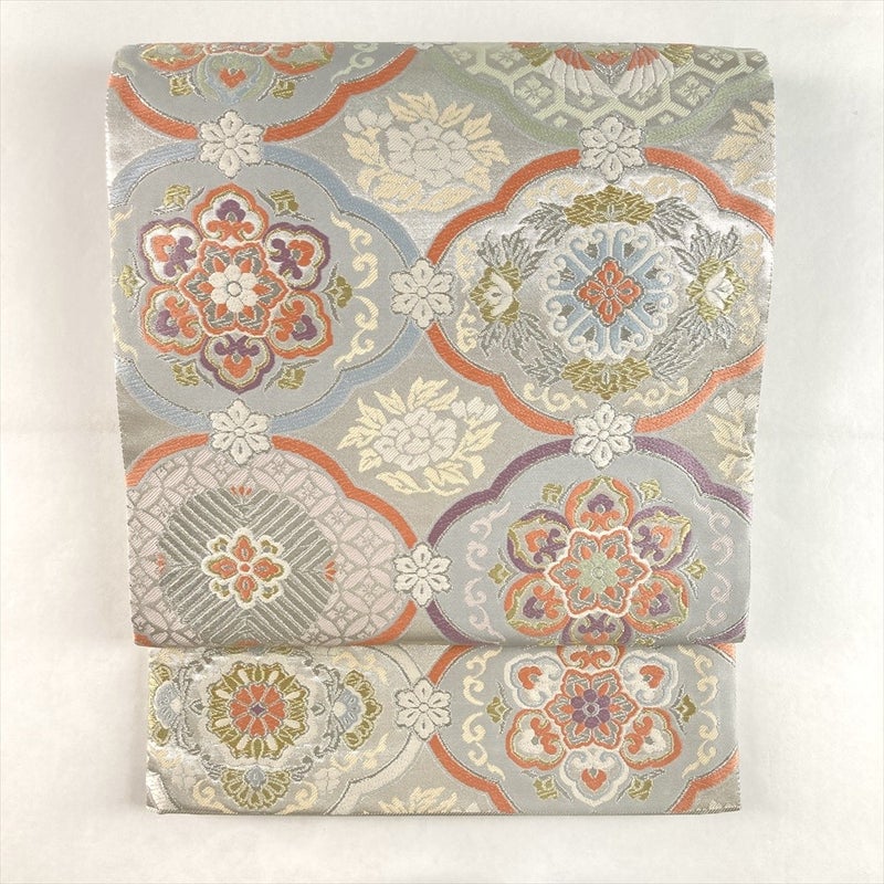 薄いグレーと銀を基調に、大きめの花菱文を中心に華紋や向かい鶴を配した、慶びの席にふさわしい袋帯。