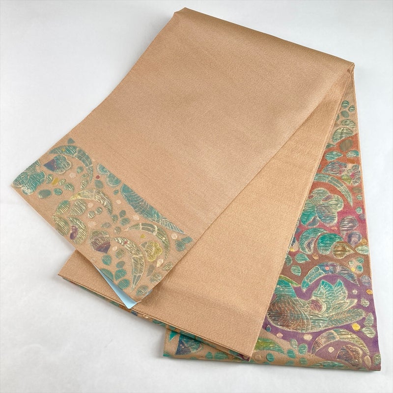 (中古)袋帯 ベージュ セミフォーマル 六通 綴れ織り 鴛鴦 花 絹