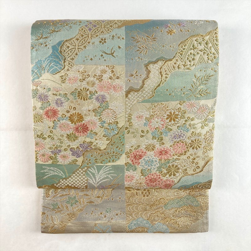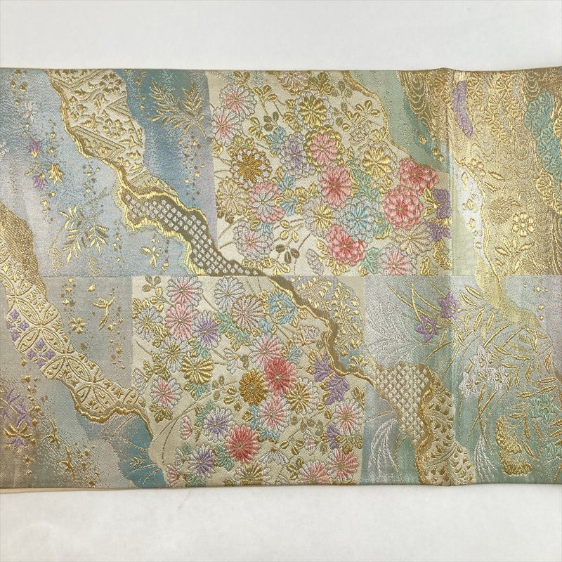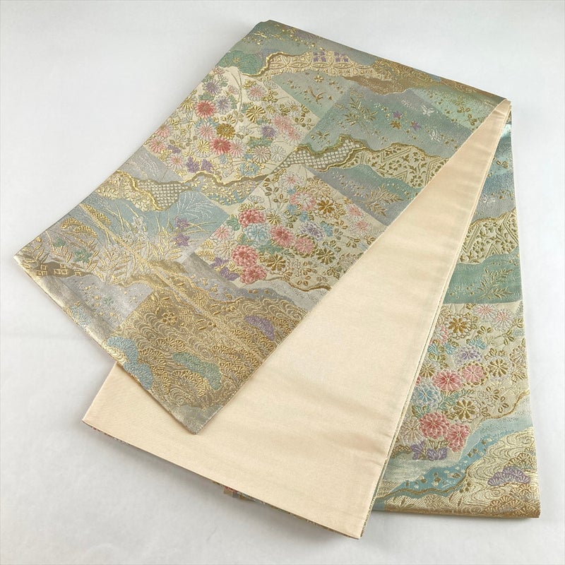 (中古)袋帯 金緑 フォーマル 六通 引き箔 変わり市松 四季草花 道長取り 絹