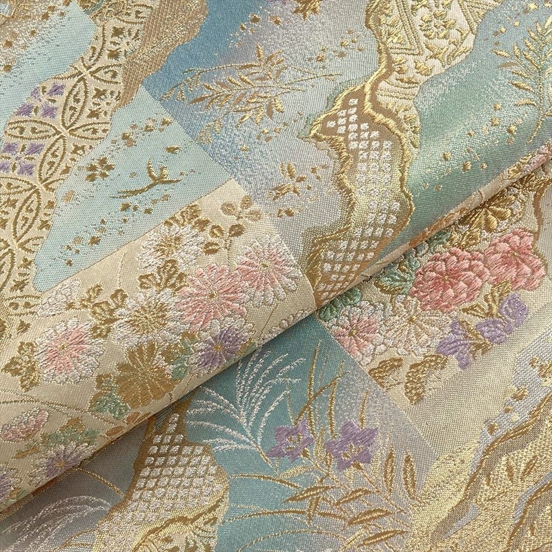 金緑地に変わり市松を背景とし、四季草花と道長取りを織り込んだ、織匠井上ならではの格調高い袋帯。