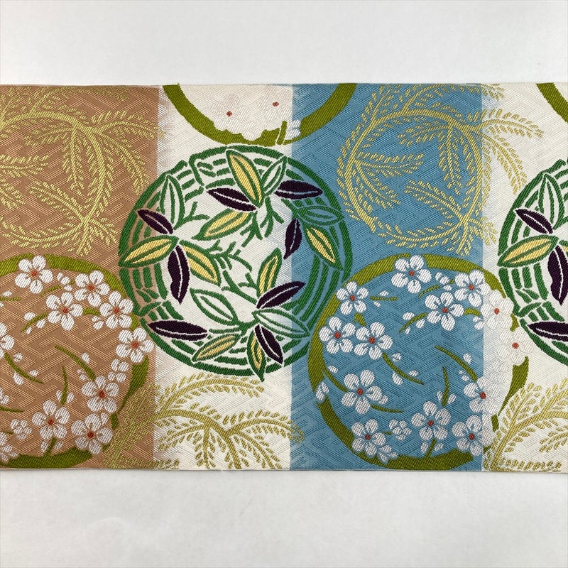 (中古)袋帯 白 ベージュ 水色 セミフォーマル 六通 織り 横段 丸に笹 丸に花 洛風林 絹