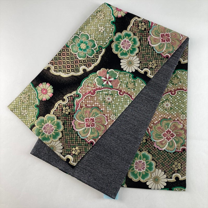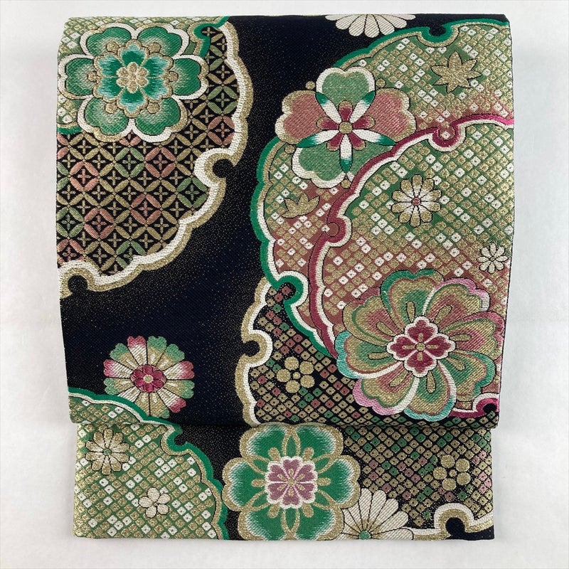 (中古)袋帯 黒 金 緑 フォーマル 六通 織り 花 雪輪 鹿の子 絹