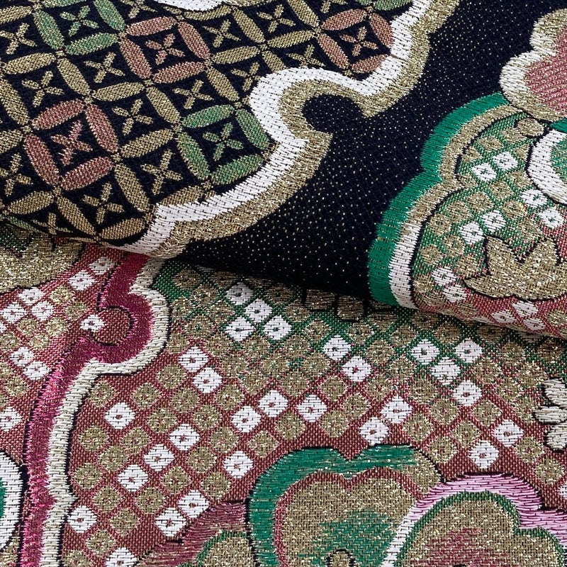重厚な黒地に、鮮やかな緑と贅沢な金糸で雪輪や花々、鹿の子文様を織り出した、格調高い一本です。