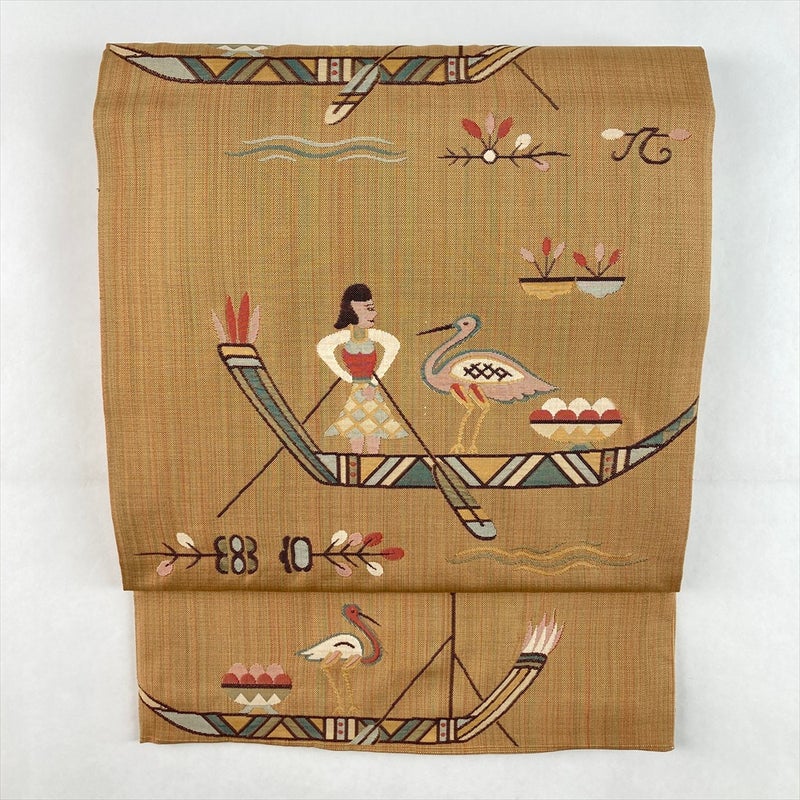 (中古)袋帯 薄茶 カジュアル 六通 織り 欧風 本袋 鳥 絹