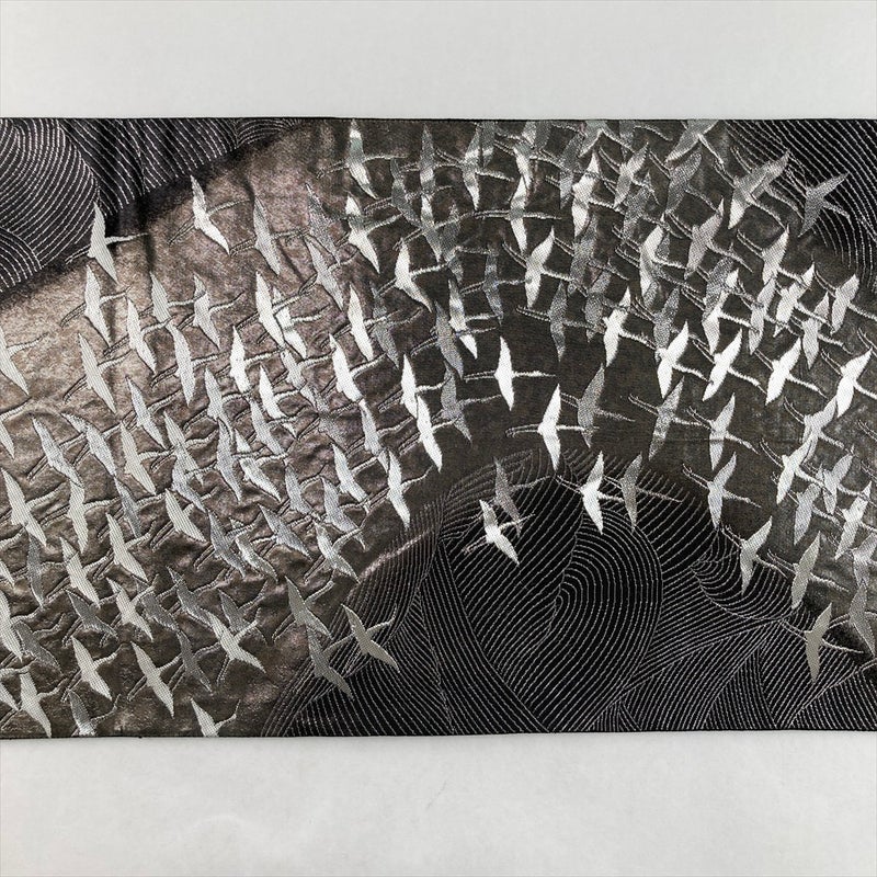 凛とした漆黒の地に、輝く銀糸で躍動感あふれる波と、優雅に舞う鳥を織り出した、格調高くもモダンな袋帯です。