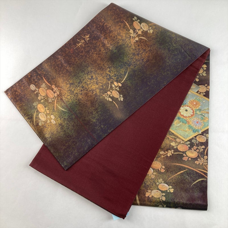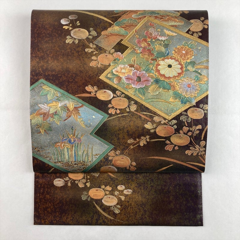 (中古)袋帯 こげ茶 フォーマル 六通 染め 松菱 四季花 螺鈿細工 丸菊 引き箔 絹