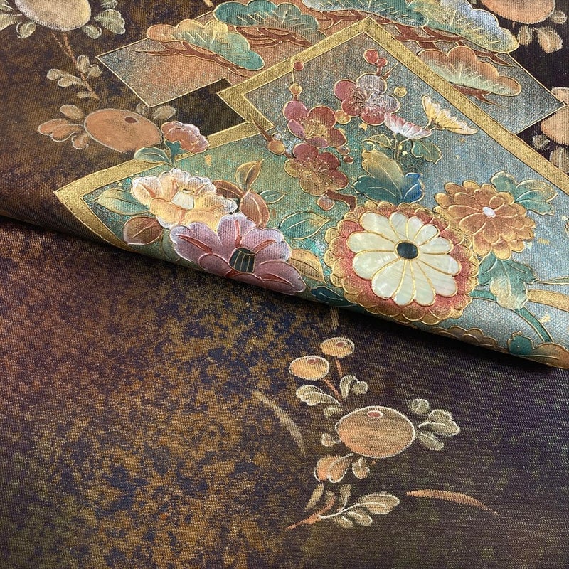 【色柄】こげ茶 フォーマル 松菱 四季花 螺鈿細工 丸菊 引き箔 染め 六通