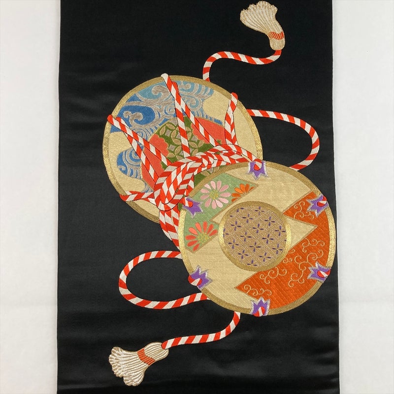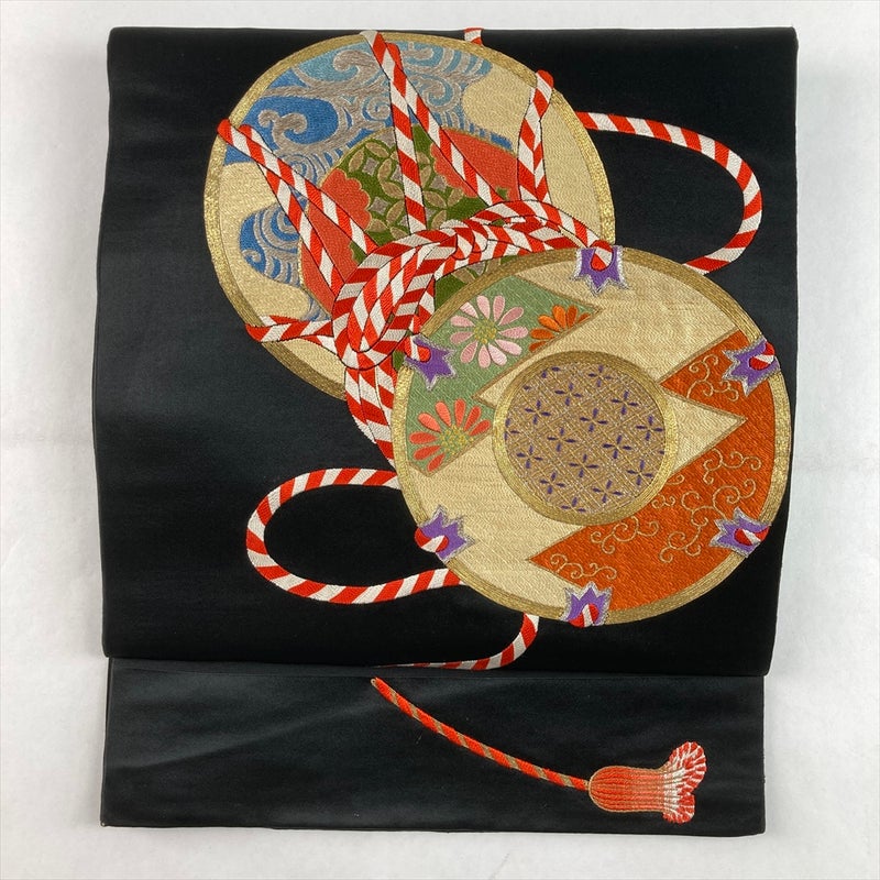 黒地に鼓と扇の吉祥文様を配した、趣深いヴィンテージ袋帯。