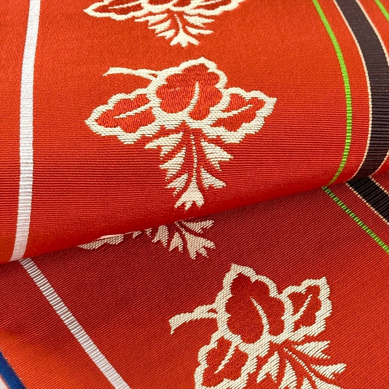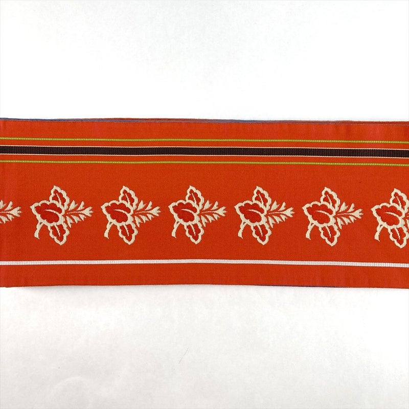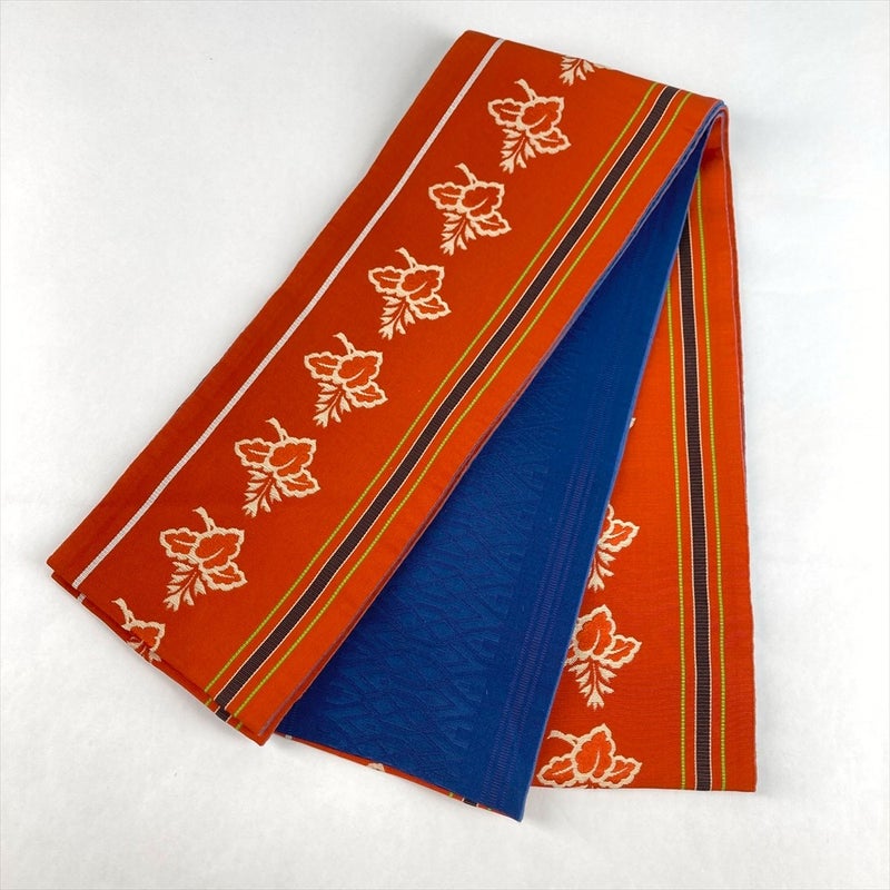 (中古)半幅帯 オレンジ カジュアル 未仕立て 織り 植物文 絹 未洗い
