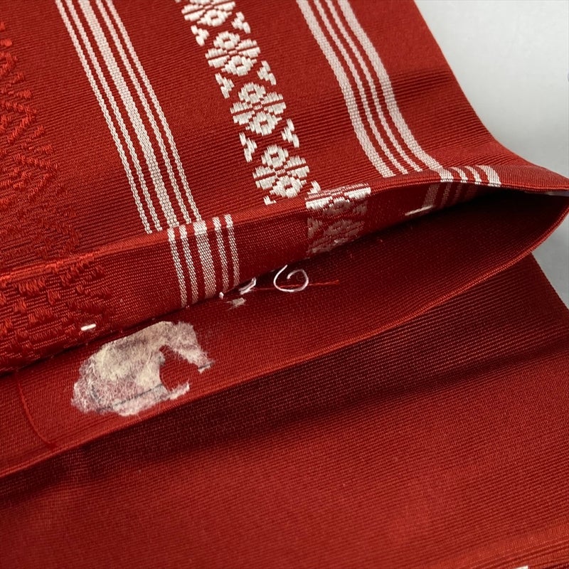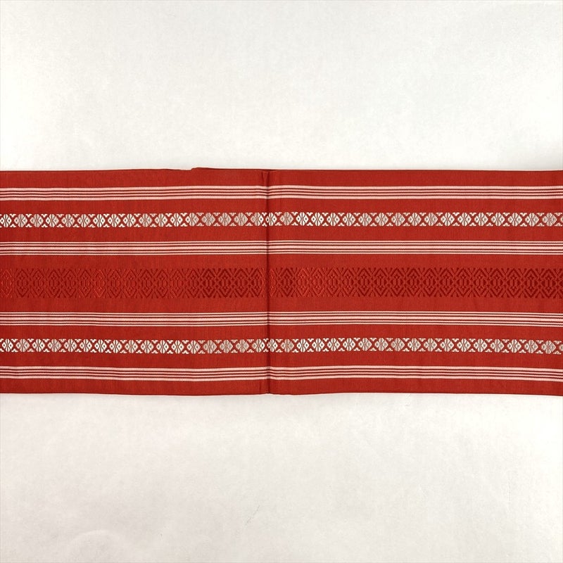(中古)半幅帯 赤茶 濃オレンジ カジュアル 織り 献上柄 絹 未洗い