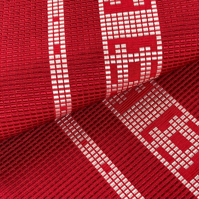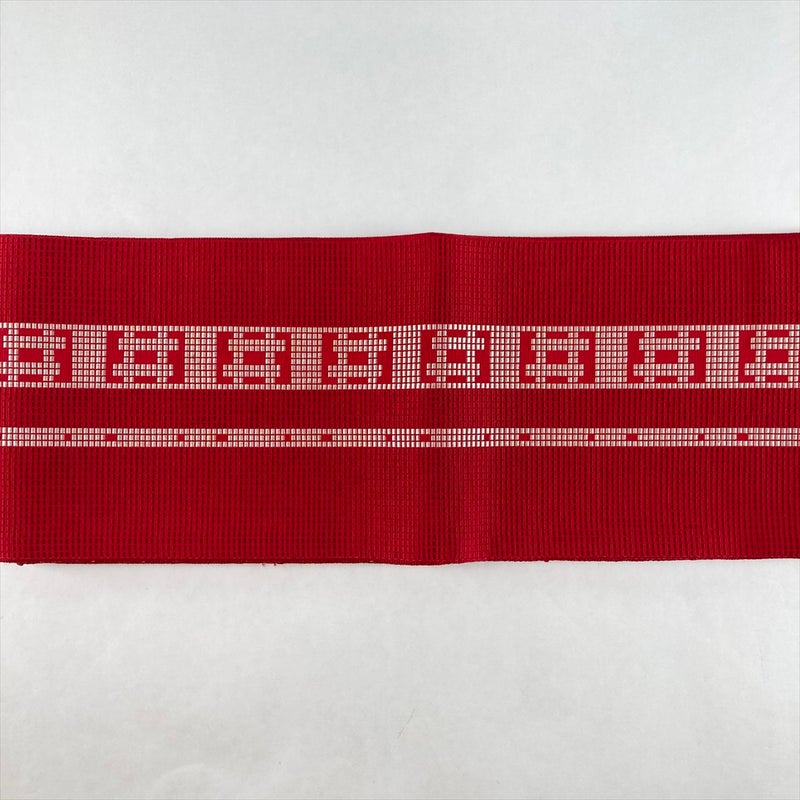 力強さと安定感のある井桁文様を、赤地に織り出した半幅帯です。