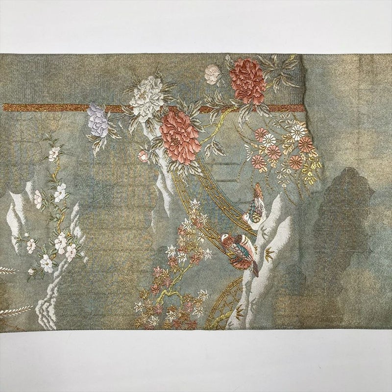 (中古)京袋帯 灰緑 セミフォーマル 六通 切箔 刺繍 金糸 銀糸色糸 雲取り 小箔 花鳥 川に橋