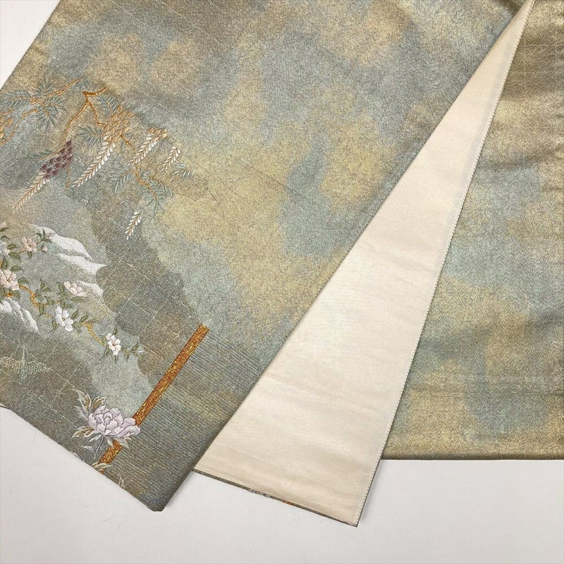 【色柄】灰緑 セミフォーマル 雲取り 小箔 花鳥 川に橋 切箔 刺繍 金糸 銀糸色糸 六通