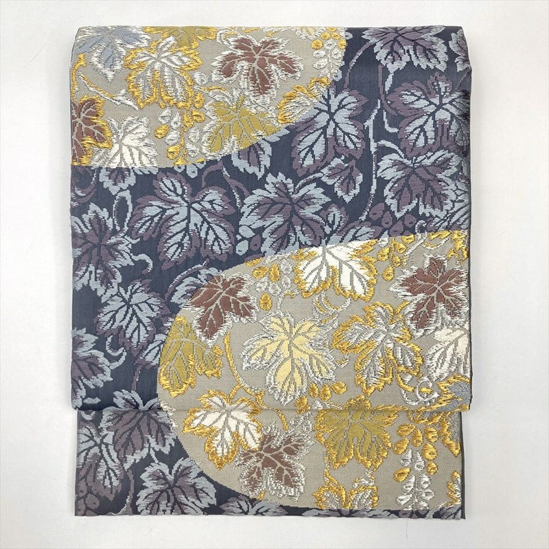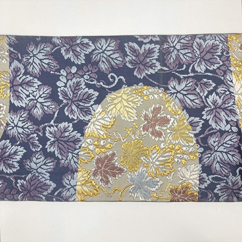 (中古)京袋帯 灰青 唐織り金糸 色糸 セミフォーマル カジュアル 六通 蔓葡萄
