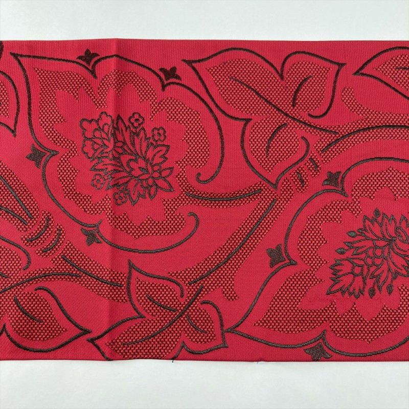 (中古)京袋帯 茜色 カジュアル セミフォーマル 六通 織り 花葉 絹