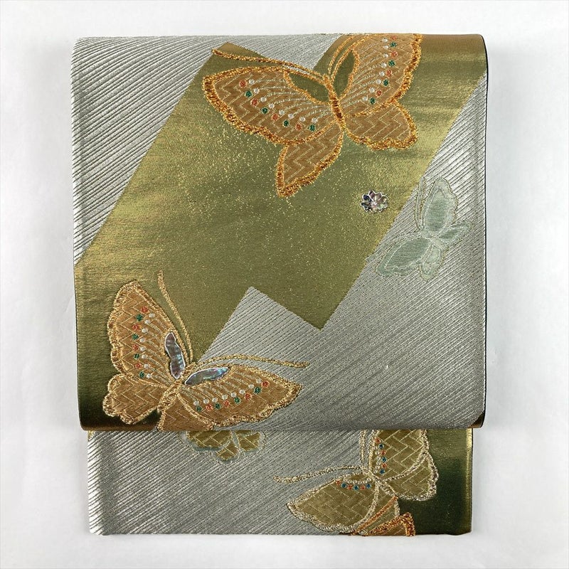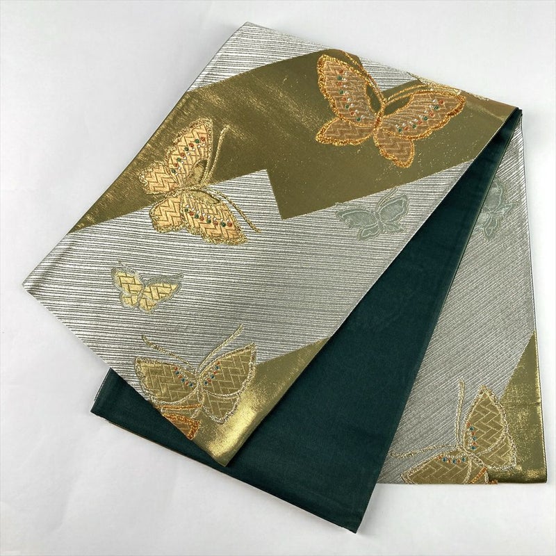 角度で蝶が浮かび上がる、奥行きのある表情が魅力。金銀の光沢が、お手元の小紋や色無地を品良くまとめてくれます。