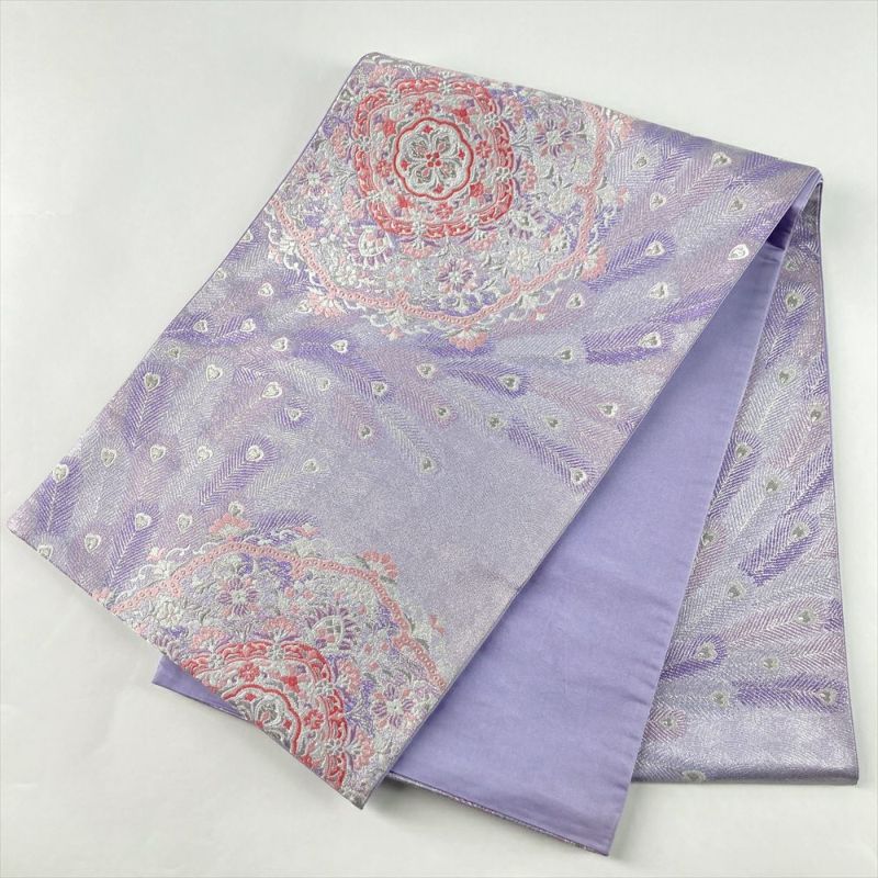 (中古)京袋帯 薄紫 銀 カジュアル セミフォーマル 六通 織り 華文 孔雀の羽根 絹