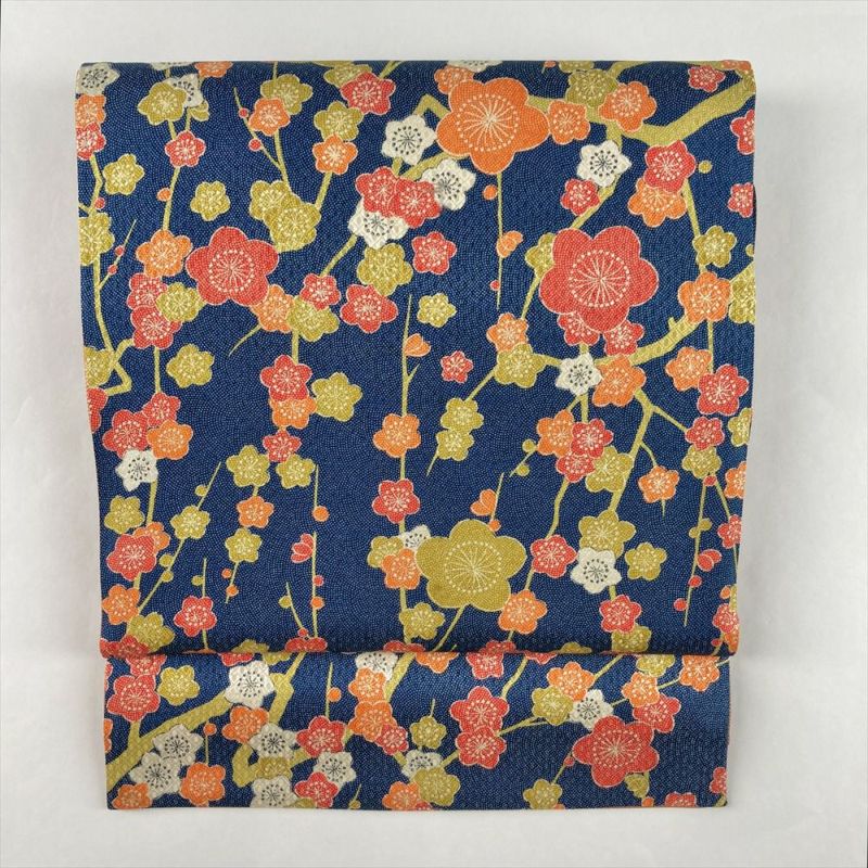 (中古)京袋帯 紺 カジュアル セミフォーマル 六通 染め 伊勢型の鮫 梅柄 絹