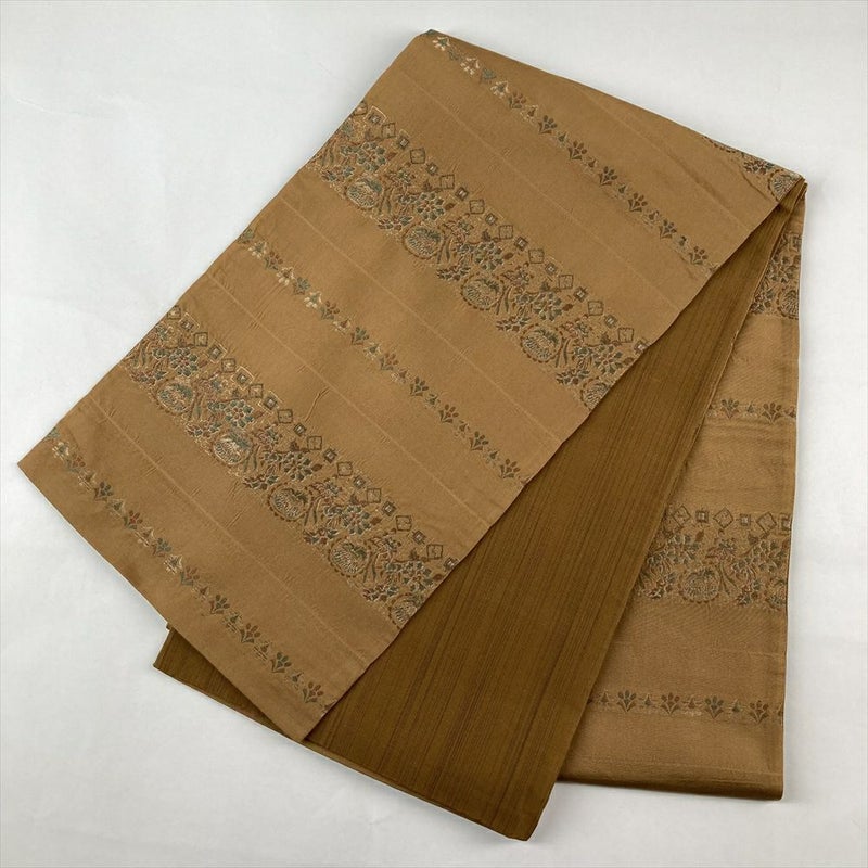 (中古)京袋帯 桑茶色 カジュアル 六通 織り 金糸 横段 オリエンタル 絹