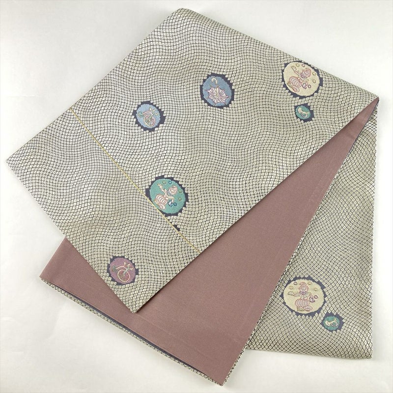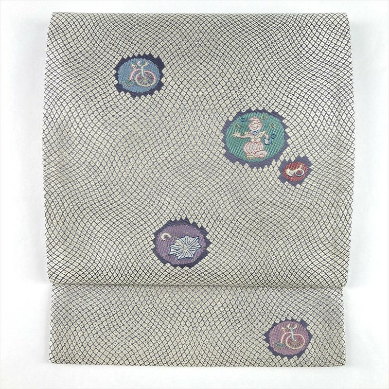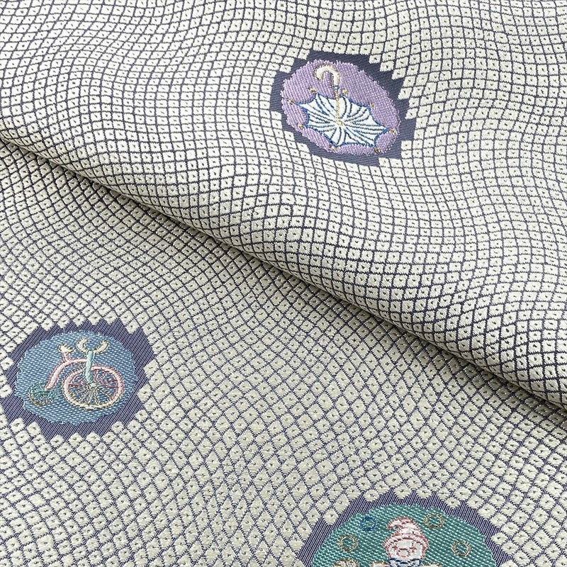 アイボリーとチャコールの地に疋田とピエロ柄を織り込んだ京袋帯。