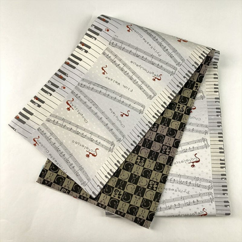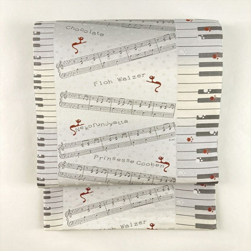 (中古)京袋帯 白鼠 グレー カジュアル 六通 織り 鍵盤に音符 猫 絹