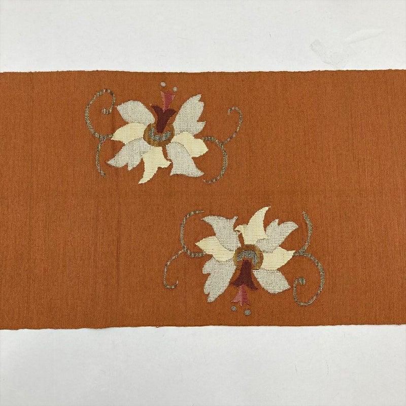 (中古)名古屋帯(八寸) オレンジ カジュアル 金糸 銀糸 蔓花 オリエンタル 松葉仕立て