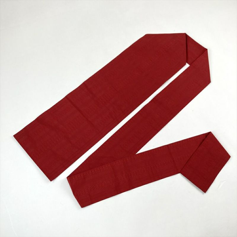 定番の献上柄の赤い帯です。カジュアルシーン向きです。普段使いにちょっとしたおでかけに、お好きなコーディネートをお楽しみくださいませ。たれ、胴、手先にシミが見られます。