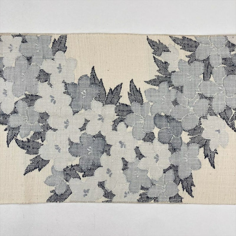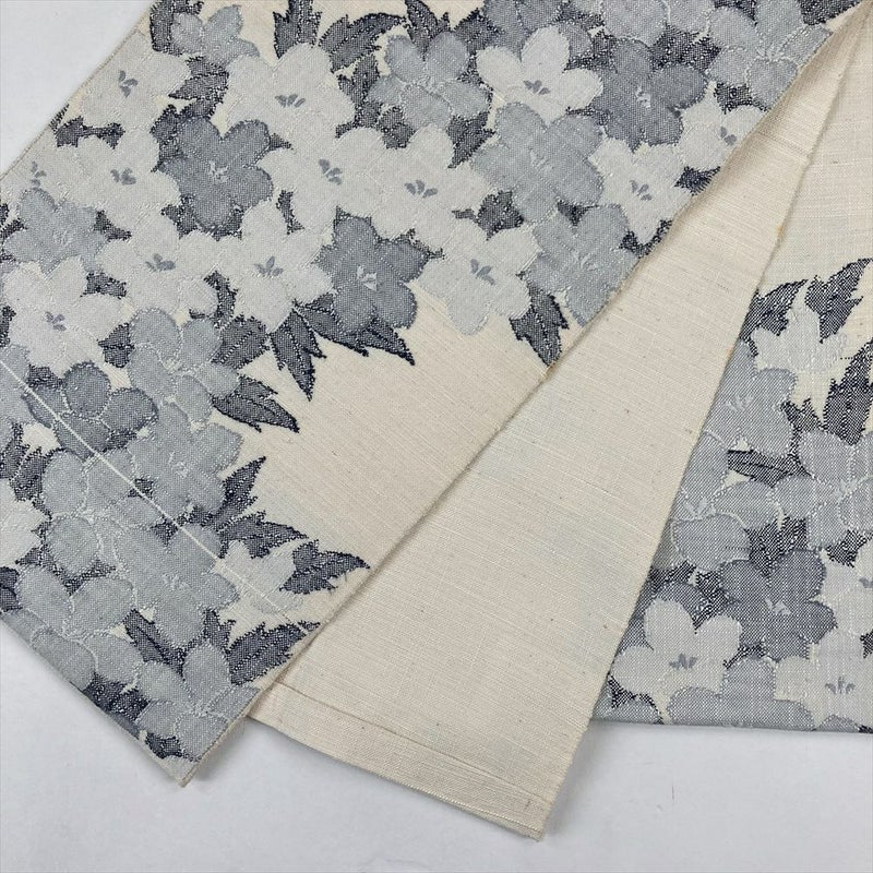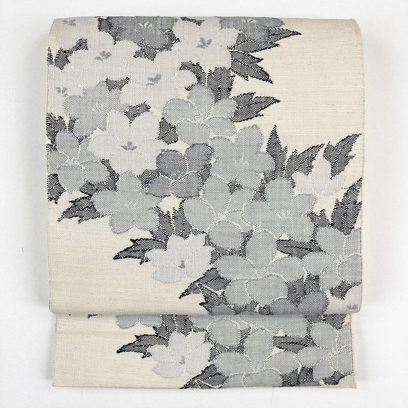 (中古)名古屋帯(八寸) 白 紬地 カジュアル 植物 花 モノトーン