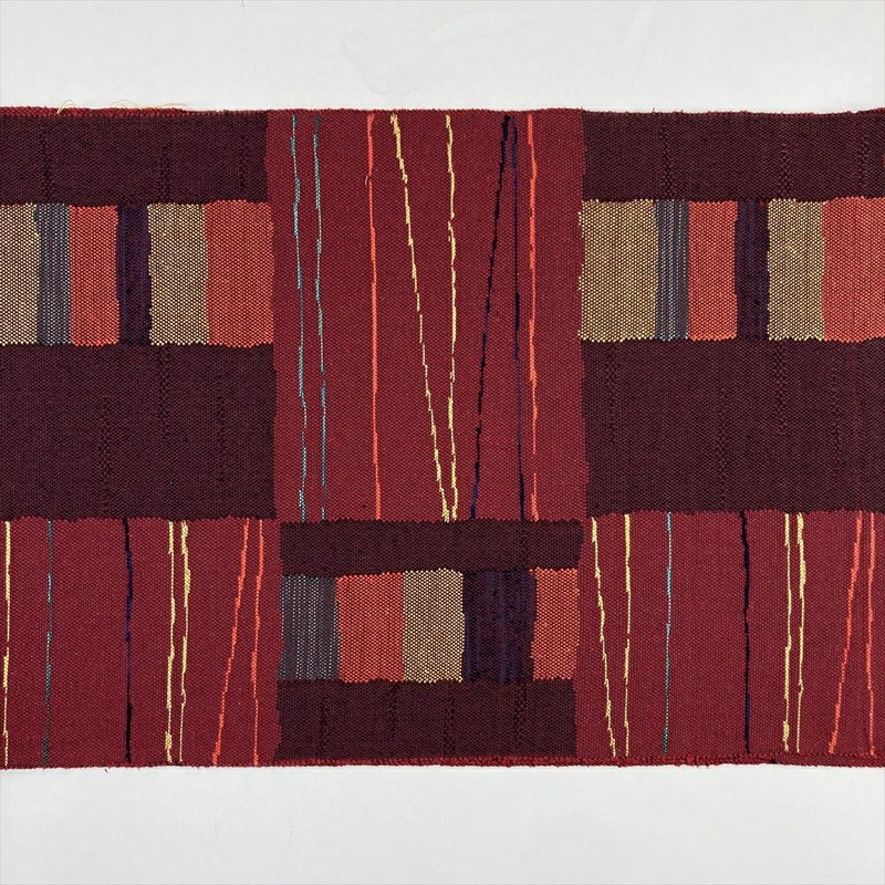 (中古)名古屋帯(八寸) 臙脂 カジュアル 変わり市松 抽象柄