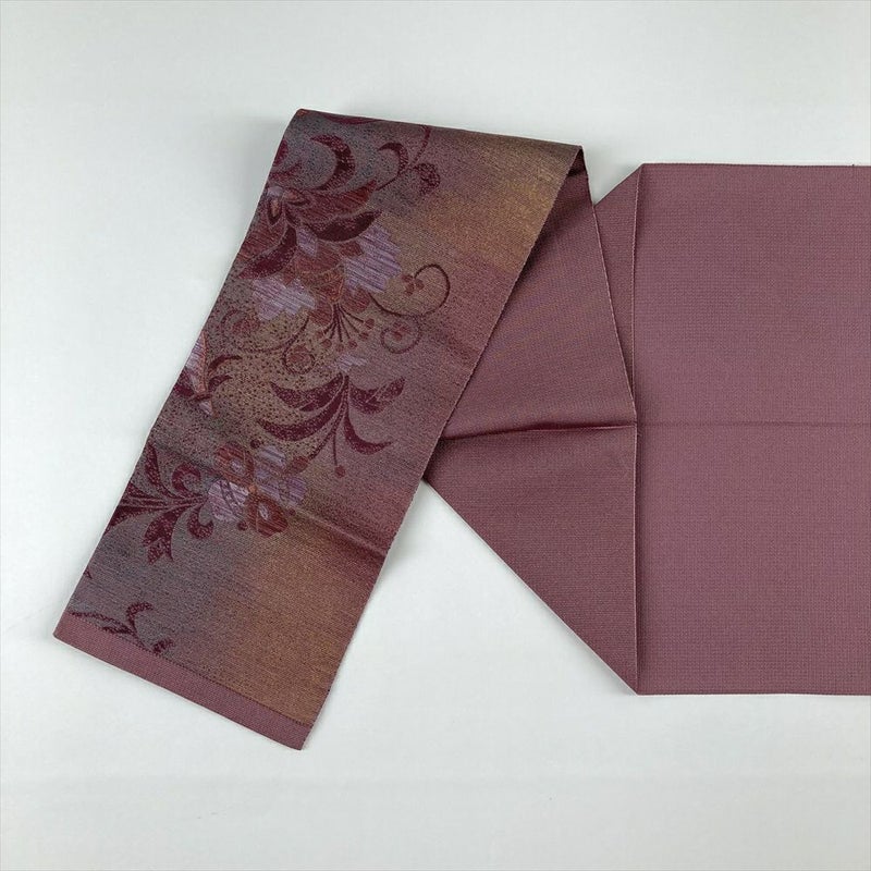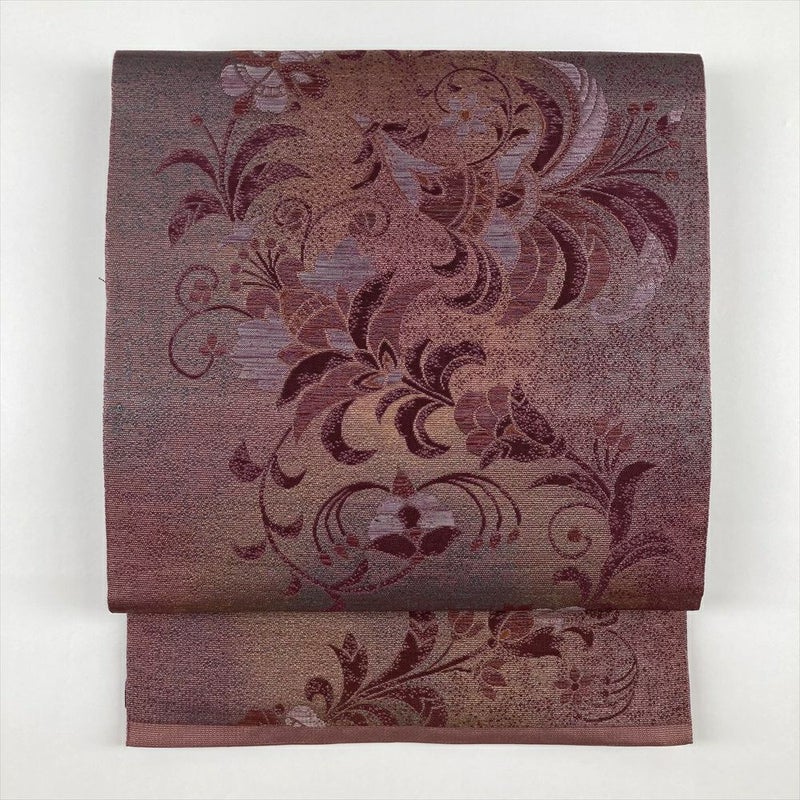 (中古)名古屋帯 薄赤紫色 カジュアル 松葉仕立て 織り オリエンタルな草花 グラデーション