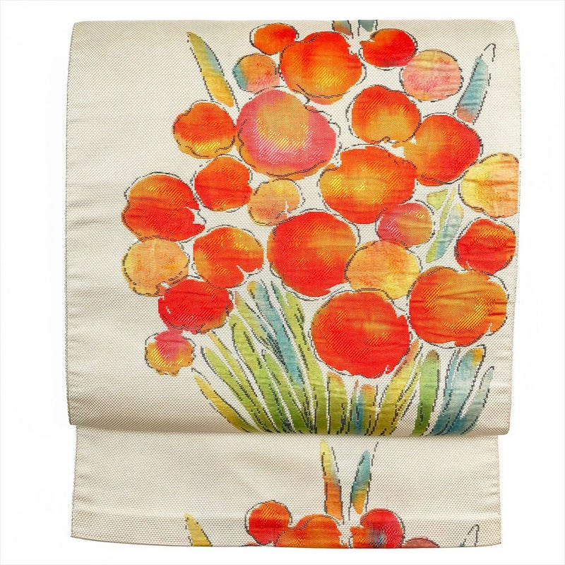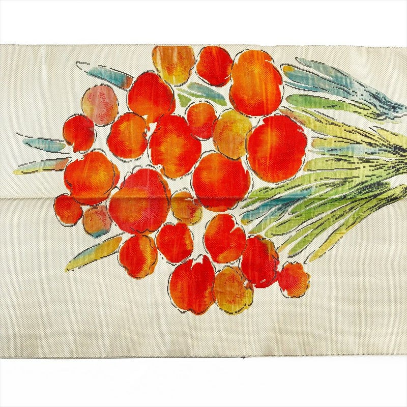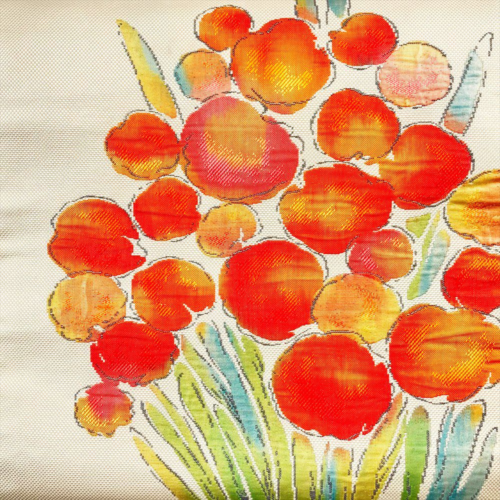 【色柄】薄ベージュ色 カジュアル 朱色の花 緑の葉 切箔 ふくれ織り調