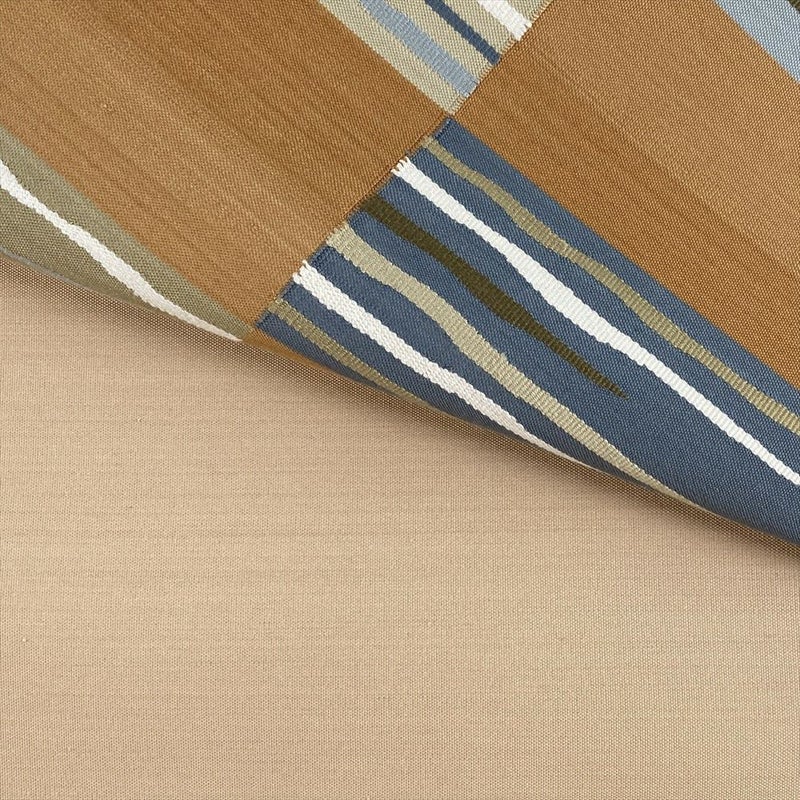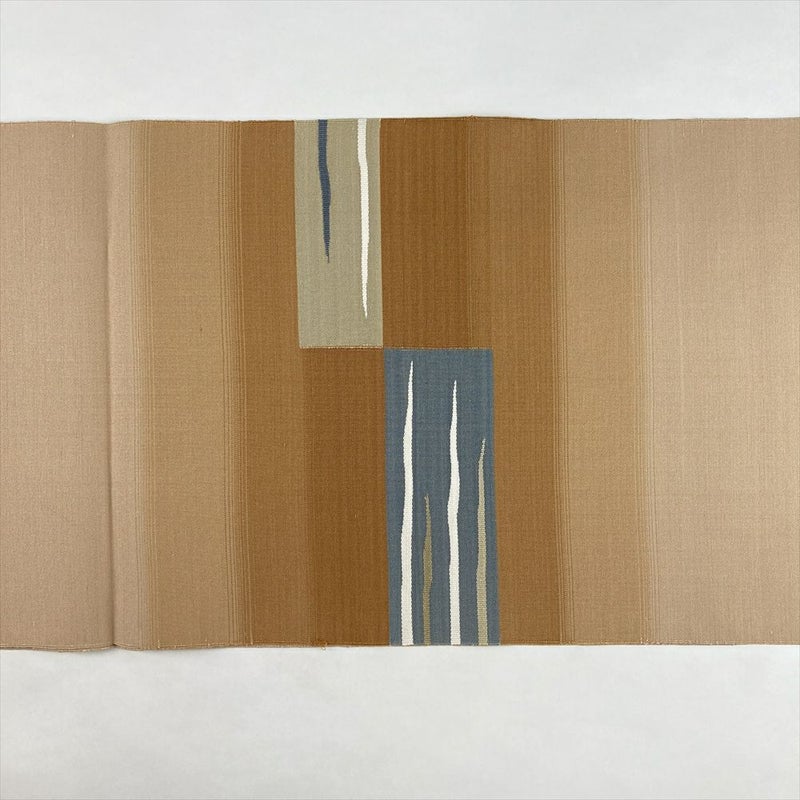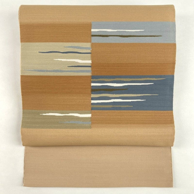 やわらかな薄茶とベージュの落ち着いた色合いに、織りで描かれた抽象柄が上品に映える名古屋帯。