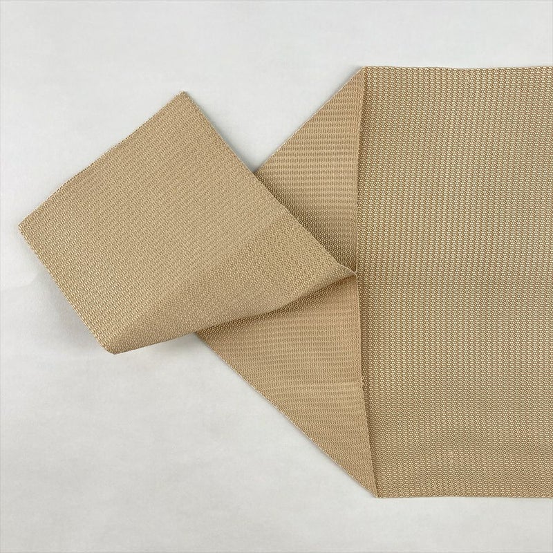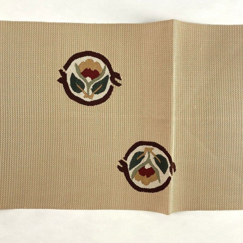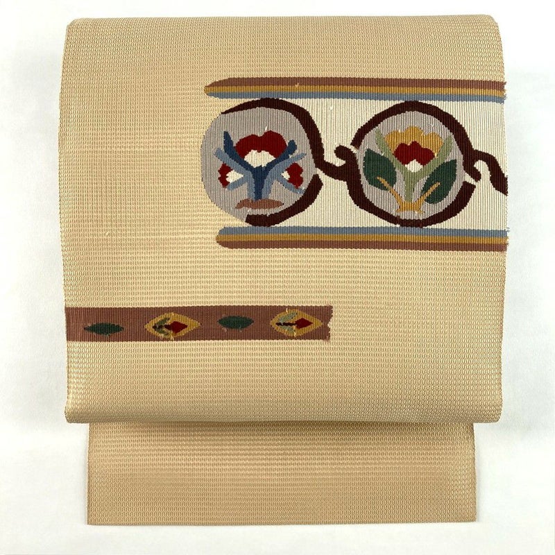 やわらかな薄茶・ベージュ地に色糸で織り上げられた花模様が映える名古屋帯。